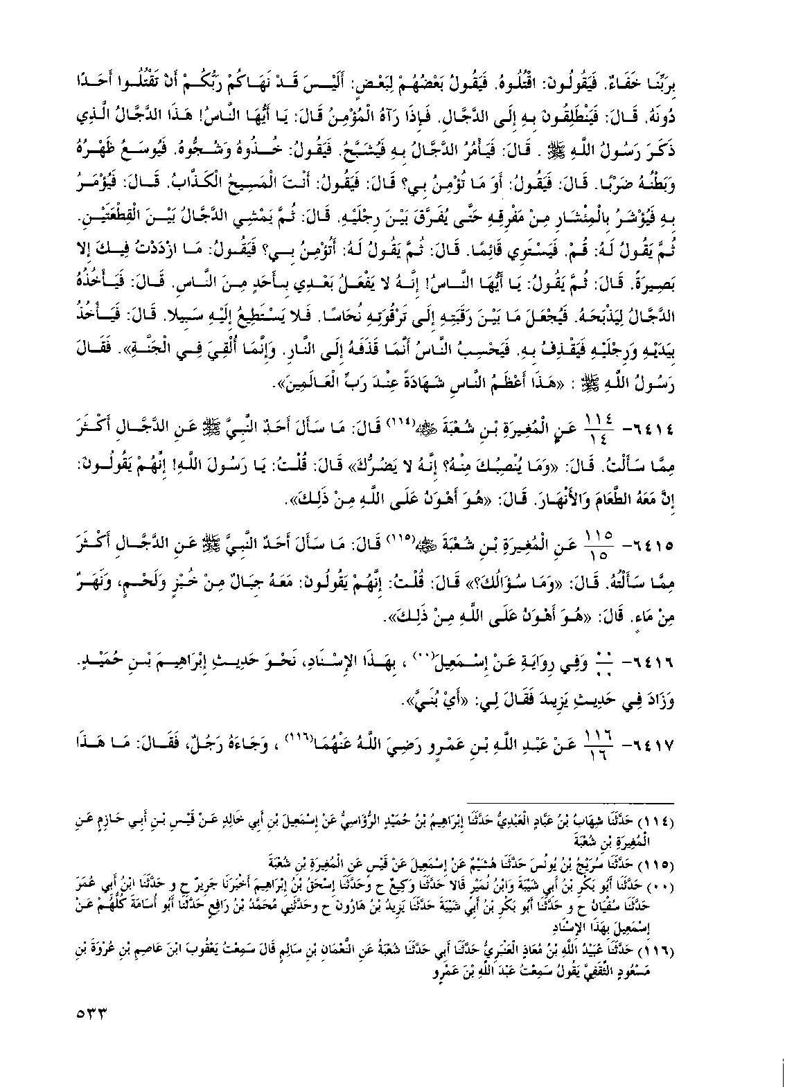 6414 - عن المغيرة بن شعبة رضي الله عنه قال ما سأل أحد النبي صلى الله عليه وسلم عن الدجال أكثر مما سألت قال "وما ينصبك منه إنه لا يضرك" قال قلت يا رسول الله إنهم يقولون إن معه الطعام والأنهار قال "هو أهون على الله من ذلك"