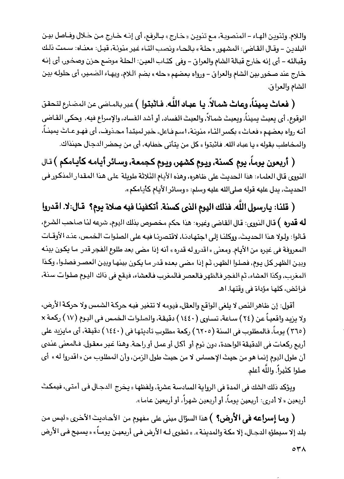 (أربعون يوما يوم كسنة ويوم كشهر ويوم كجمعة وسائر أيامه كأيامكم) قال النووي قال العلماء هذا الحديث على ظاهره وهذه الأيام الثلاثة طويلة على هذا المقدار المذكور في الحديث يدل عليه قوله صلى الله عليه وسلم "وسائر الأيام كأيامكم"