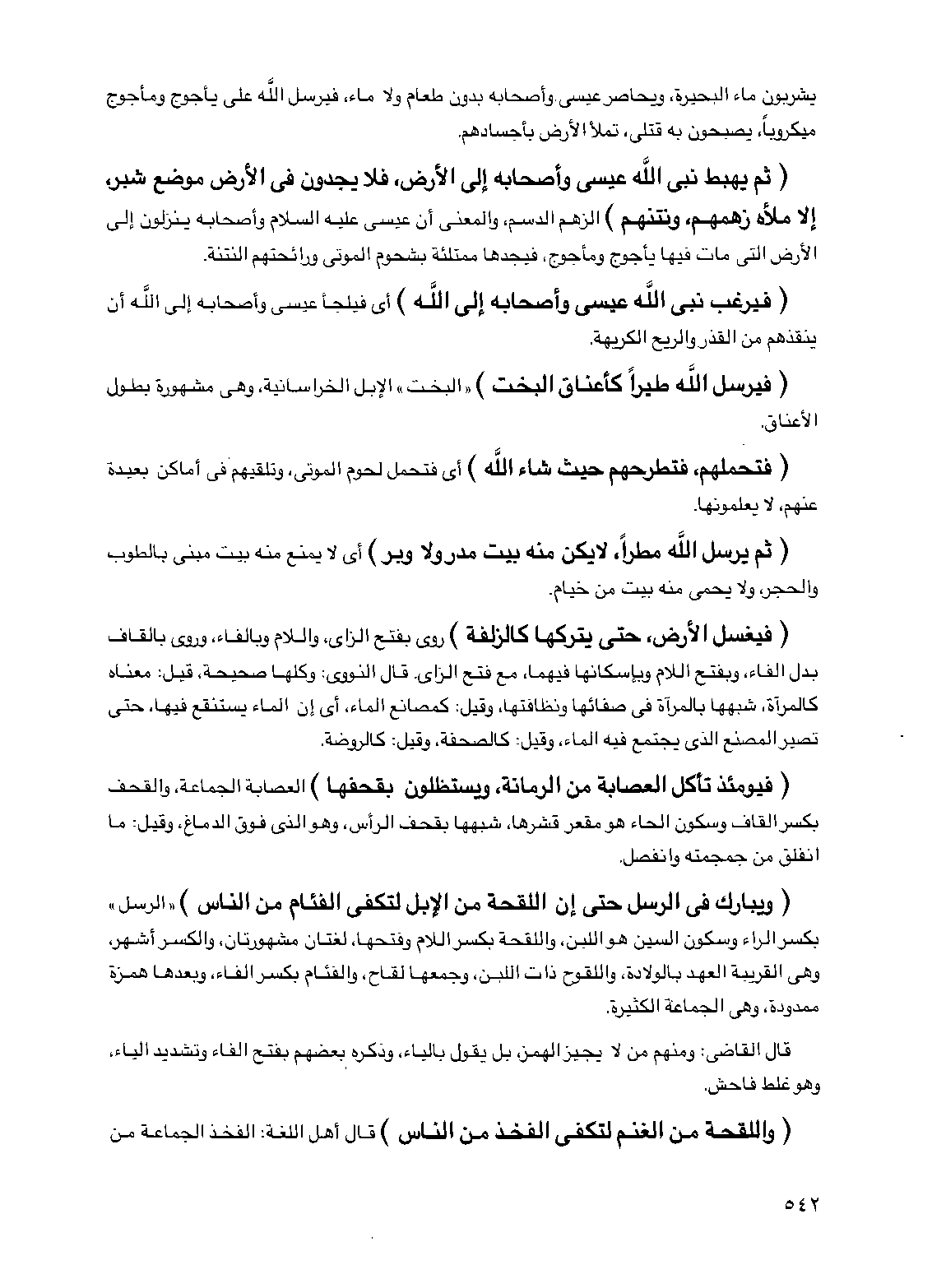 (ثم يهبط نبي الله عيسى وأصحابه إلى الأرض فلا يجدون في الأرض موضع شبر إلا ملأه زهمهم ونتنهم) الزهم الدسم والمعنى أن عيسى عليه السلام وأصحابه ينزلون إلى الأرض التي مات فيها يأجوج ومأجوج فيجدها ممتلئة بشحوم الموتى ورائحتهم النتنة