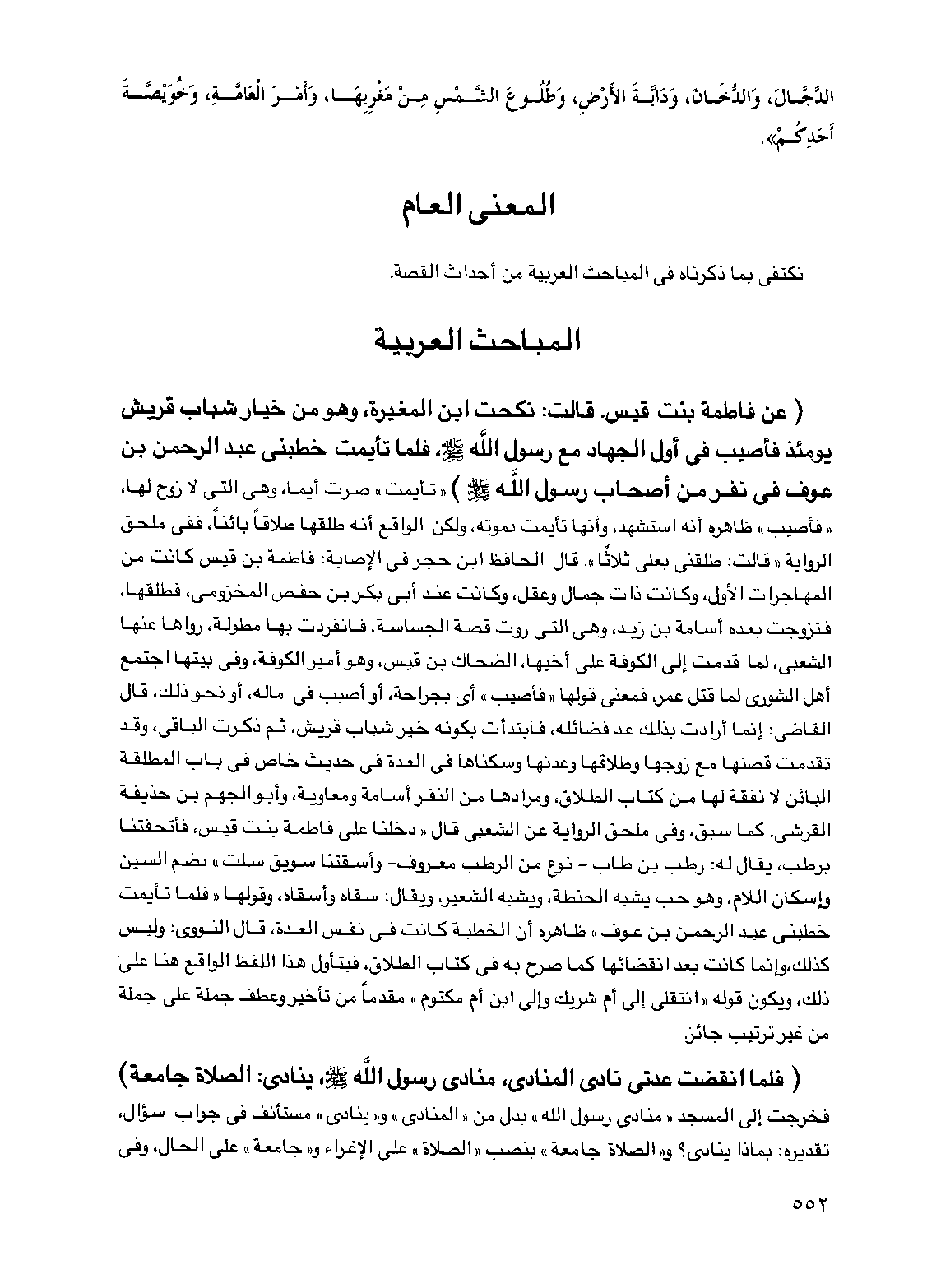 (فلما انقضت عدتي نادى المنادي منادي رسول الله صلى الله عليه وسلم ينادي الصلاة جامعة) فخرجت إلى المسجد "منادي رسول الله" بدل من "المنادي" و"ينادي" مستأنف في جواب سؤال تقديره بماذا ينادي و"الصلاة جامعة" بنصب "الصلاة" على الإغراء و"جامعة" على الحال وفي