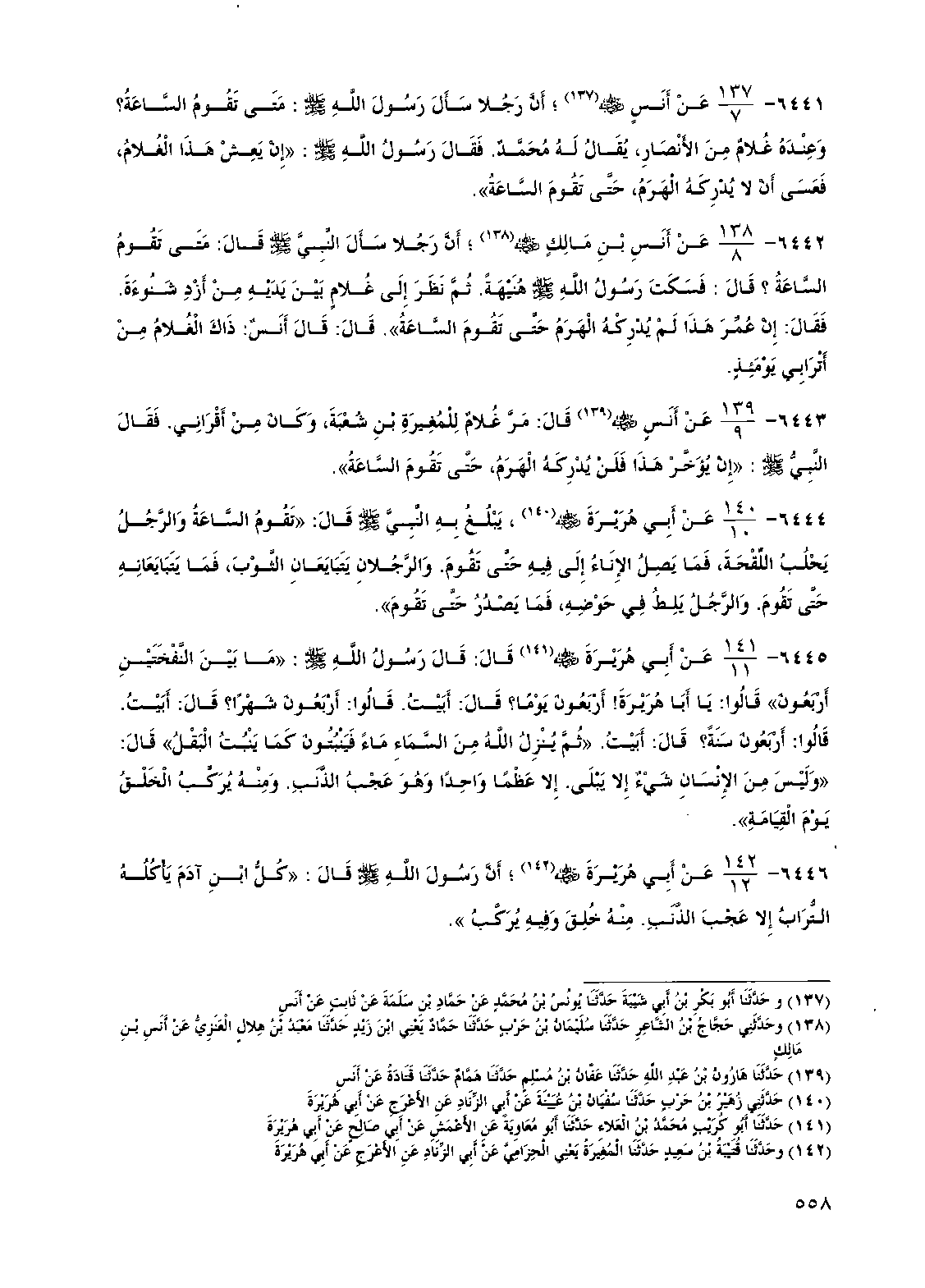 6446 - عن أبي هريرة رضي الله عنه أن رسول الله صلى الله عليه وسلم قال "كل ابن آدم يأكله التراب إلا عجب الذنب منه خلق وفيه يركب"