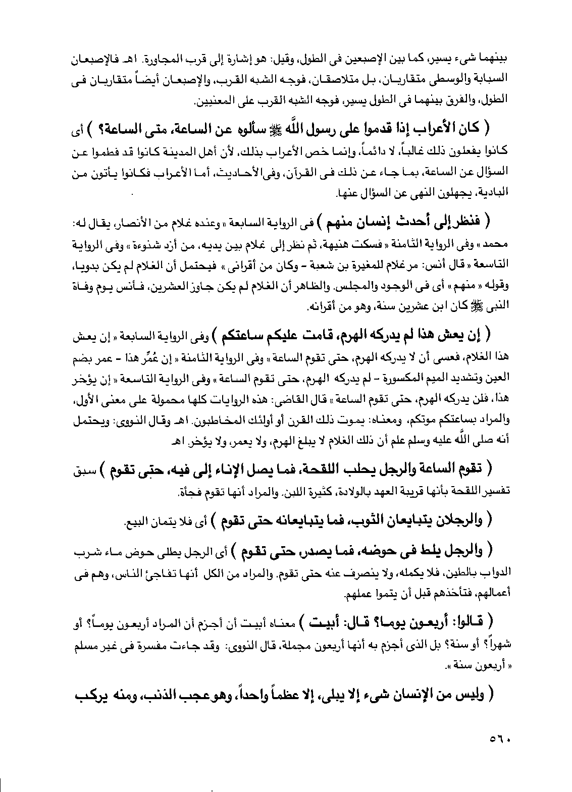 (إن يعش هذا لم يدركه الهرم قامت عليكم ساعتكم) وفي الرواية السابعة "إن يعش هذا الغلام فعسى أن لا يدركه الهرم حتى تقوم الساعة" وفي الرواية الثامنة "إن عمر هذا عمر بضم العين وتشديد الميم المكسورة لم يدركه الهرم حتى تقوم الساعة" وفي الرواية التاسعة "إن يؤخر هذا فلن يدركه الهرم حتى تقوم الساعة" قال القاضي هذه الروايات كلها محمولة على معنى الأول والمراد بساعتكم موتكم ومعناه يموت ذلك القرن أو أولئك المخاطبون اهـ وقال النووي ويحتمل أنه صلى الله عليه وسلم علم أن ذلك الغلام لا يبلغ الهرم ولا يعمر ولا يؤخر اهـ