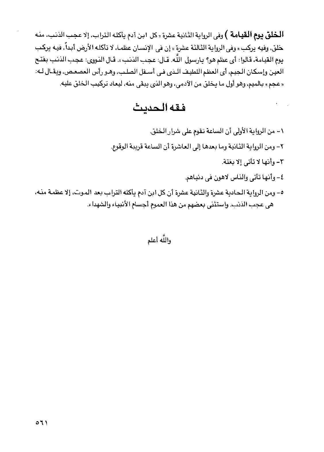 5 - ومن الرواية الحادية عشرة والثانية عشرة أن كل ابن آدم يأكله التراب بعد الموت إلا عظمة منه هي عجب الذنب واستثنى بعضهم من هذا العموم أجسام الأنبياء والشهداء