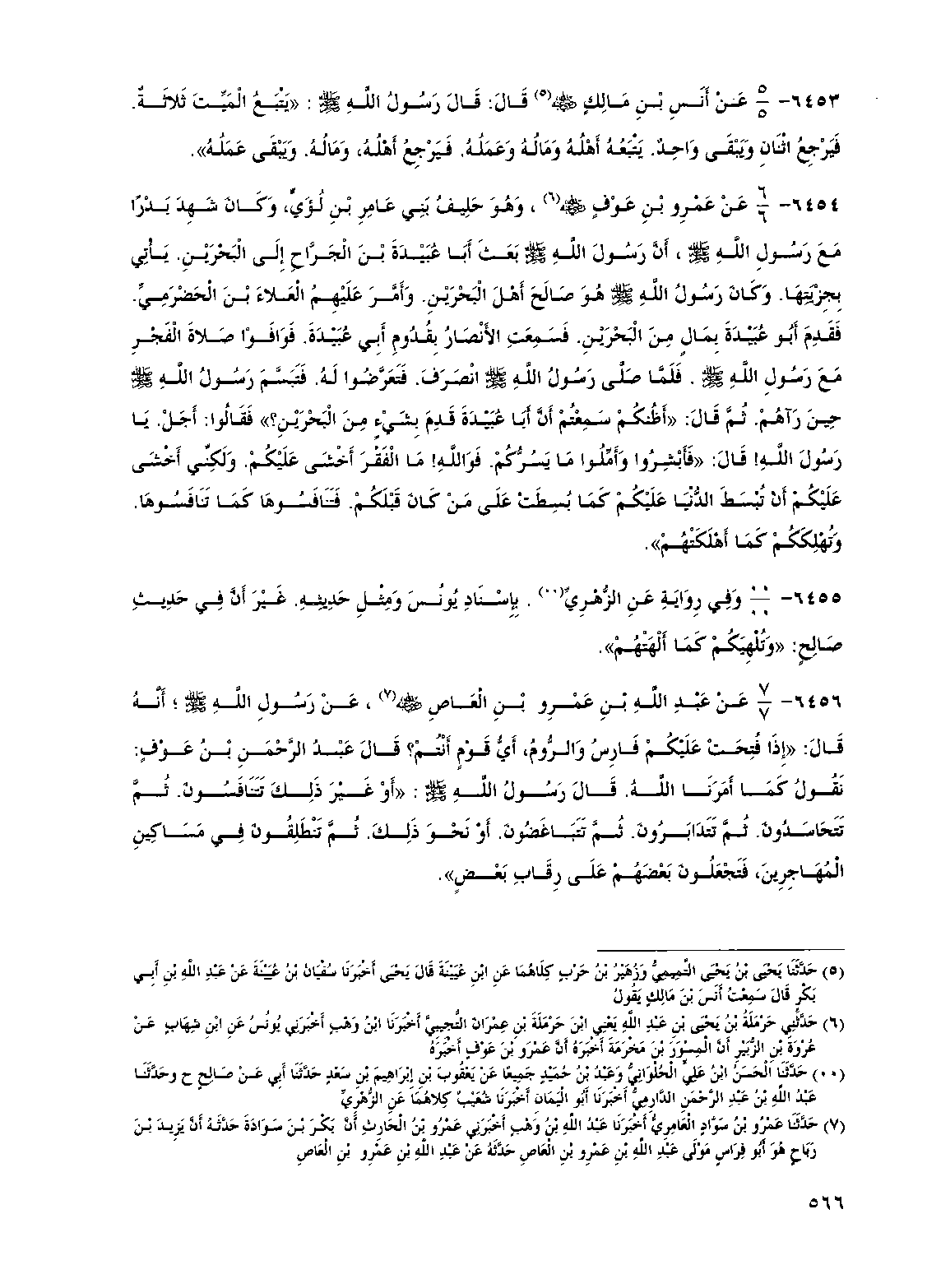 6454 - عن عمرو بن عوف رضي الله عنه وهو حليف بني عامر بن لؤي وكان شهد بدرا مع رسول الله صلى الله عليه وسلم أن رسول الله صلى الله عليه وسلم بعث أبا عبيدة بن الجراح إلى البحرين يأتي بجزيتها وكان رسول الله صلى الله عليه وسلم هو صالح أهل البحرين وأمر عليهم العلاء بن الحضرمي فقدم أبو عبيدة بمال من البحرين فسمعت الأنصار بقدوم أبي عبيدة فوافوا صلاة الفجر مع رسول الله صلى الله عليه وسلم فلما صلى رسول الله صلى الله عليه وسلم انصرف فتعرضوا له فتبسم رسول الله صلى الله عليه وسلم حين رآهم ثم قال "أظنكم سمعتم أن أبا عبيدة قدم بشيء من البحرين" فقالوا أجل يا رسول الله قال "فأبشروا وأملوا ما يسركم فوالله ما الفقر أخشى عليكم ولكني أخشى عليكم أن تبسط الدنيا عليكم كما بسطت على من كان قبلكم فتنافسوها كما تنافسوها وتهلككم كما أهلكتهم"
