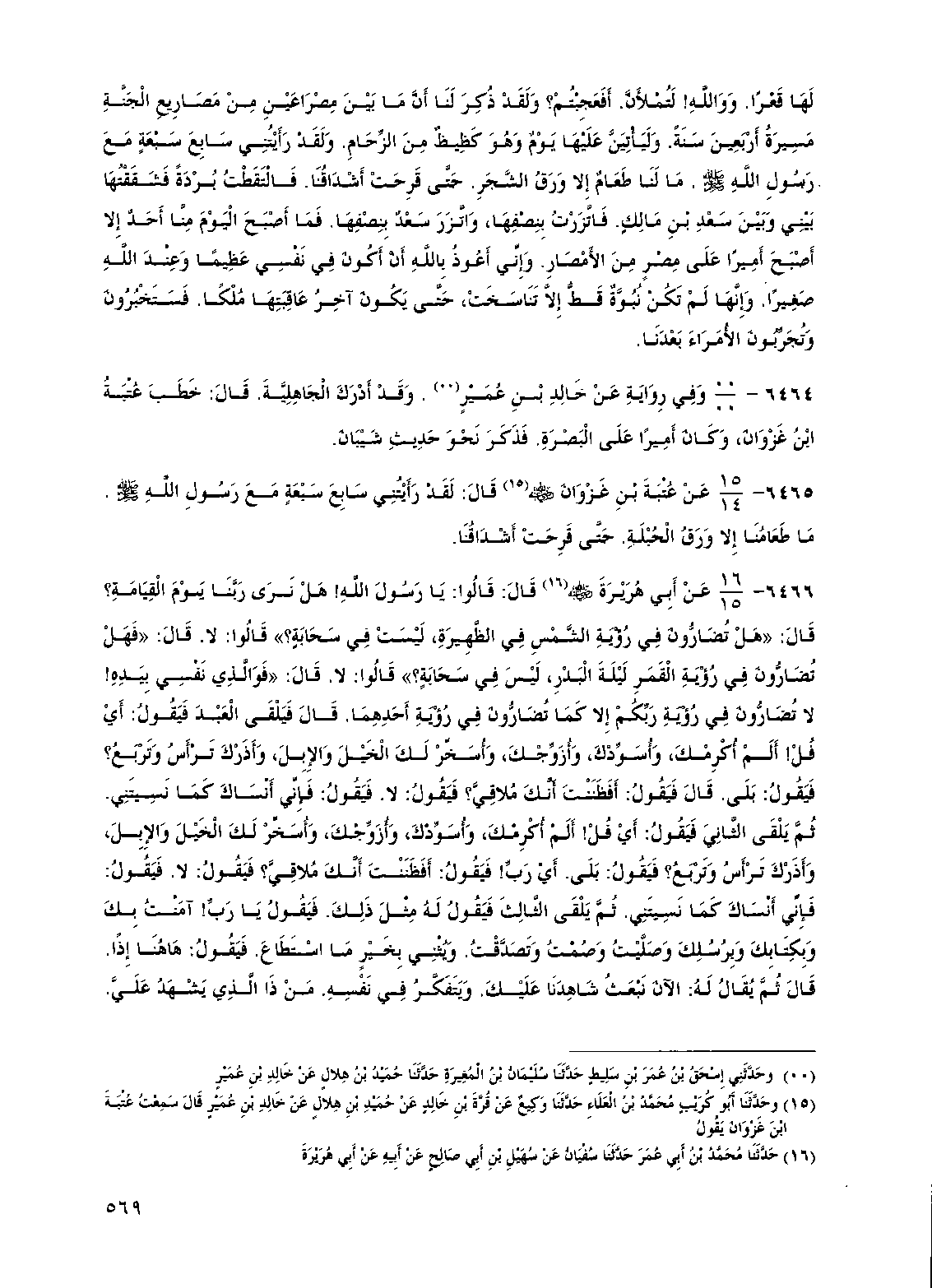 6466 - عن أبي هريرة رضي الله عنه قال قالوا يا رسول الله هل نرى ربنا يوم القيامة قال "هل تضارون في رؤية الشمس في الظهيرة ليست في سحابة" قالوا لا قال "فهل تضارون في رؤية القمر ليلة البدر ليس في سحابة" قالوا لا قال "فوالذي نفسي بيده لا تضارون في رؤية ربكم إلا كما تضارون في رؤية أحدهما قال فيلقى العبد فيقول أي فل ألم أكرمك وأسودك وأزوجك وأسخر لك الخيل والإبل وأذرك ترأس وتربع فيقول بلى قال فيقول أفظننت أنك ملاقي فيقول لا فيقول فإني أنساك كما نسيتني ثم يلقى الثاني فيقول أي فل ألم أكرمك وأسودك وأزوجك وأسخر لك الخيل والإبل وأذرك ترأس وتربع فيقول بلى أي رب فيقول أفظننت أنك ملاقي فيقول لا فيقول فإني أنساك كما نسيتني ثم يلقى الثالث فيقول له مثل ذلك فيقول يا رب آمنت بك وبكتابك وبرسلك وصليت وصمت وتصدقت ويثني بخير ما استطاع فيقول ها هنا إذا قال ثم يقال له الآن نبعث شاهدنا عليك ويتفكر في نفسه من ذا الذي يشهد علي