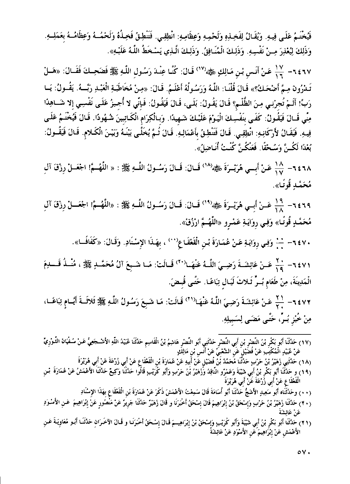 6468 - عن أبي هريرة رضي الله عنه قال قال رسول الله صلى الله عليه وسلم "اللهم اجعل رزق آل محمد قوتا"