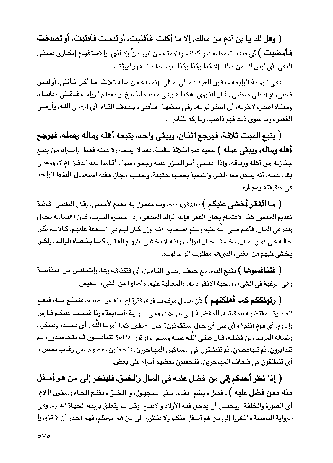 ففي الرواية الرابعة "يقول العبد مالي مالي إنما له من ماله ثلاث ما أكل فأفنى أو لبس فأبلى أو أعطى فاقتنى" قال النووي هكذا هو في معظم النسخ ولمعظم الرواة "فاقتنى" بالتاء ومعناه ادخره لآخرته أي ادخر ثوابه وفي بعضها "فأقنى" بحذف التاء أي أرضى الله وأرضى الفقير "وما سوى ذلك فهو ذاهب وتاركه للناس"
