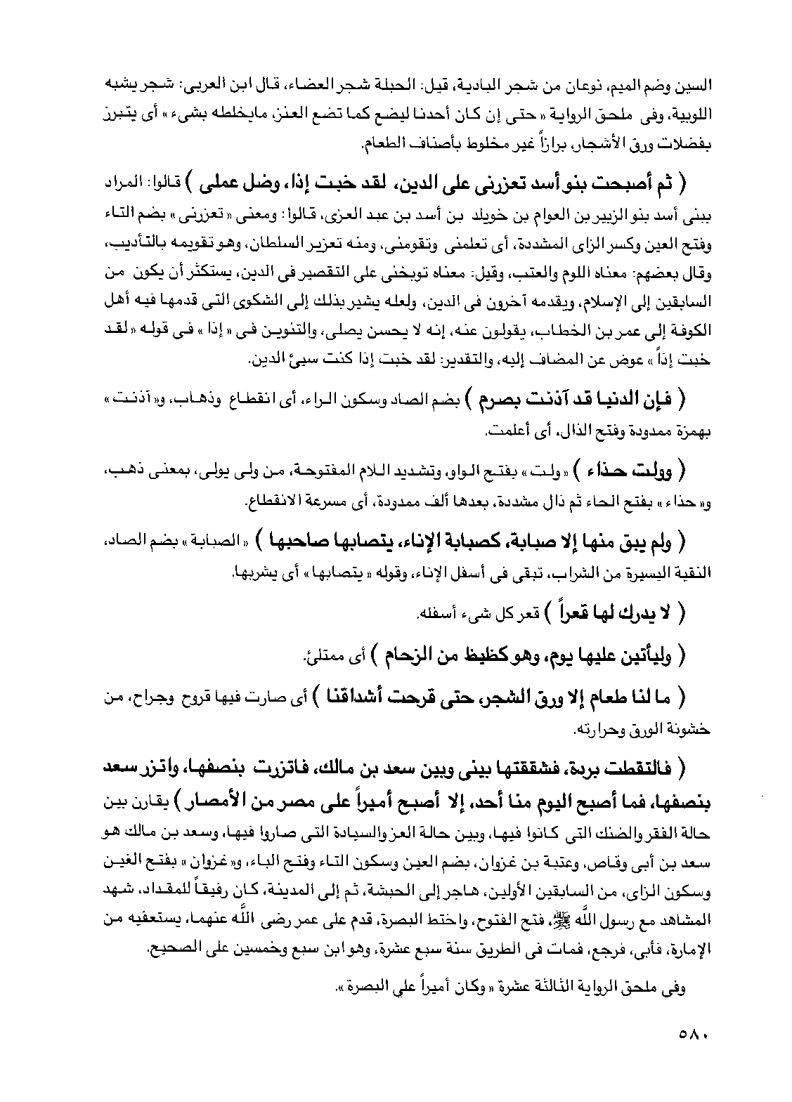 (ثم أصبحت بنو أسد تعزرني على الدين لقد خبت إذا وضل عملي) قالوا المراد ببني أسد بنو الزبير بن العوام بن خويلد بن أسد بن عبد العزى قالوا ومعنى "تعزرني" بضم التاء وفتح العين وكسر الزاي المشددة أي تعلمني وتقومني ومنه تعزير السلطان وهو تقويمه بالتأديب وقال بعضهم معناه اللوم والعتب وقيل معناه توبخني على التقصير في الدين يستكثر أن يكون من السابقين إلى الإسلام ويقدمه آخرون في الدين ولعله يشير بذلك إلى الشكوى التي قدمها فيه أهل الكوفة إلى عمر بن الخطاب يقولون عنه إنه لا يحسن يصلي والتنوين في "إذا" في قوله "لقد خبت إذا" عوض عن المضاف إليه والتقدير لقد خبت إذا كنت سيئ الدين