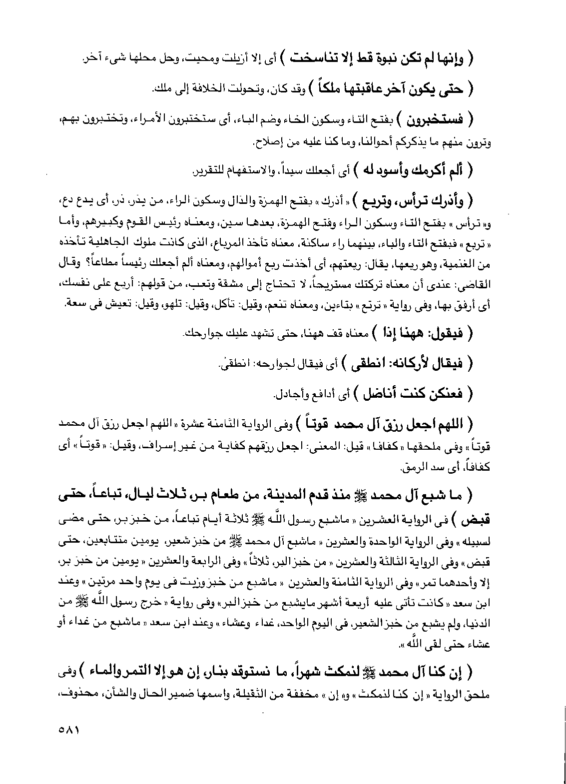 (إن كنا آل محمد صلى الله عليه وسلم لنمكث شهرا ما نستوقد بنار إن هو إلا التمر والماء) وفي ملحق الرواية "إن كنا لنمكث" و"إن" مخففة من الثقيلة واسمها ضمير الحال والشأن محذوف