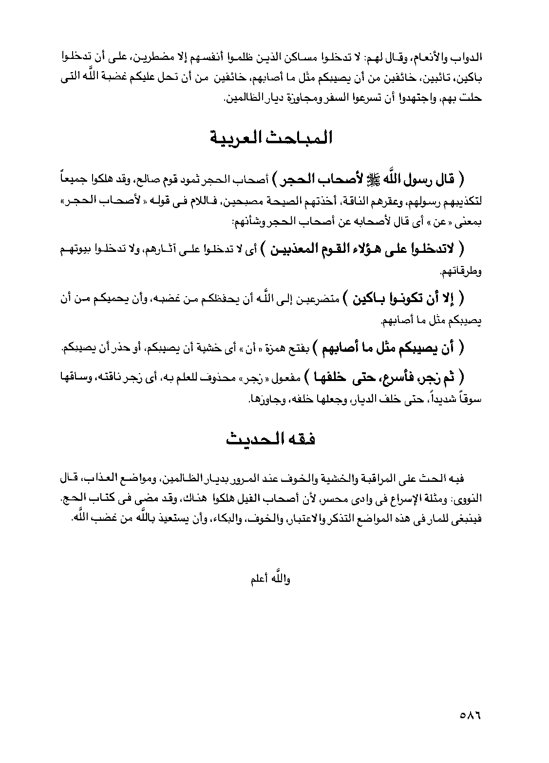 الدواب والأنعام وقال لهم لا تدخلوا مساكن الذين ظلموا أنفسهم إلا مضطرين على أن تدخلوا باكين تائبين خائفين من أن يصيبكم مثل ما أصابهم خائفين من أن تحل عليكم غضبة الله التي حلت بهم واجتهدوا أن تسرعوا السفر ومجاوزة ديار الظالمين