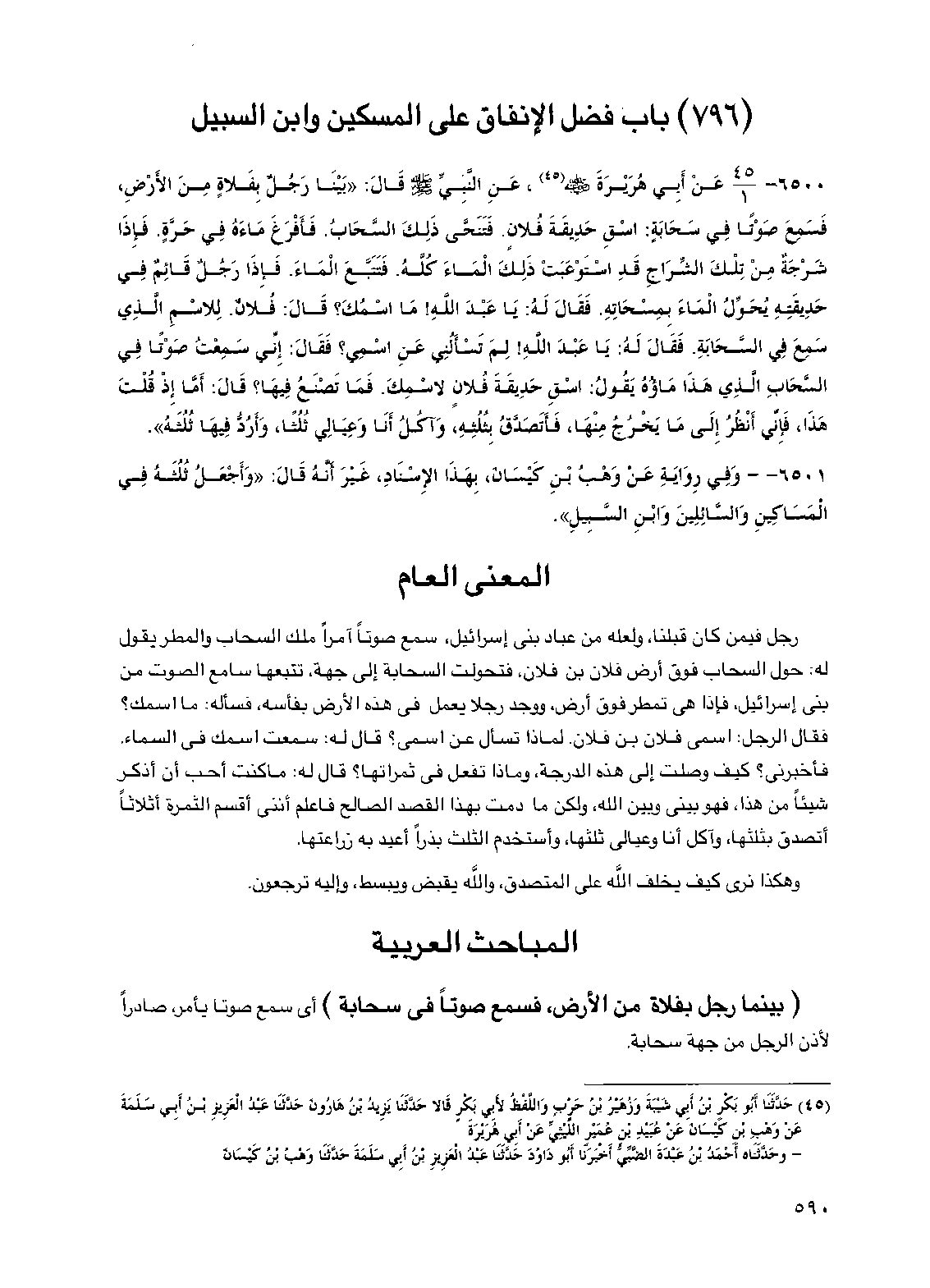 6500 - عن أبي هريرة رضي الله عنه عن النبي صلى الله عليه وسلم قال "بينا رجل بفلاة من الأرض فسمع صوتا في سحابة اسق حديقة فلان فتنحى ذلك السحاب فأفرغ ماءه في حرة فإذا شرجة من تلك الشراج قد استوعبت ذلك الماء كله فتتبع الماء فإذا رجل قائم في حديقته يحول الماء بمسحاته فقال له يا عبد الله ما اسمك قال فلان للاسم الذي سمع في السحابة فقال له يا عبد الله لم تسألني عن اسمي فقال إني سمعت صوتا في السحاب الذي هذا ماؤه يقول اسق حديقة فلان لاسمك فما تصنع فيها قال أما إذ قلت هذا فإني أنظر إلى ما يخرج منها فأتصدق بثلثه وآكل أنا وعيالي ثلثا وأرد فيها ثلثه"
