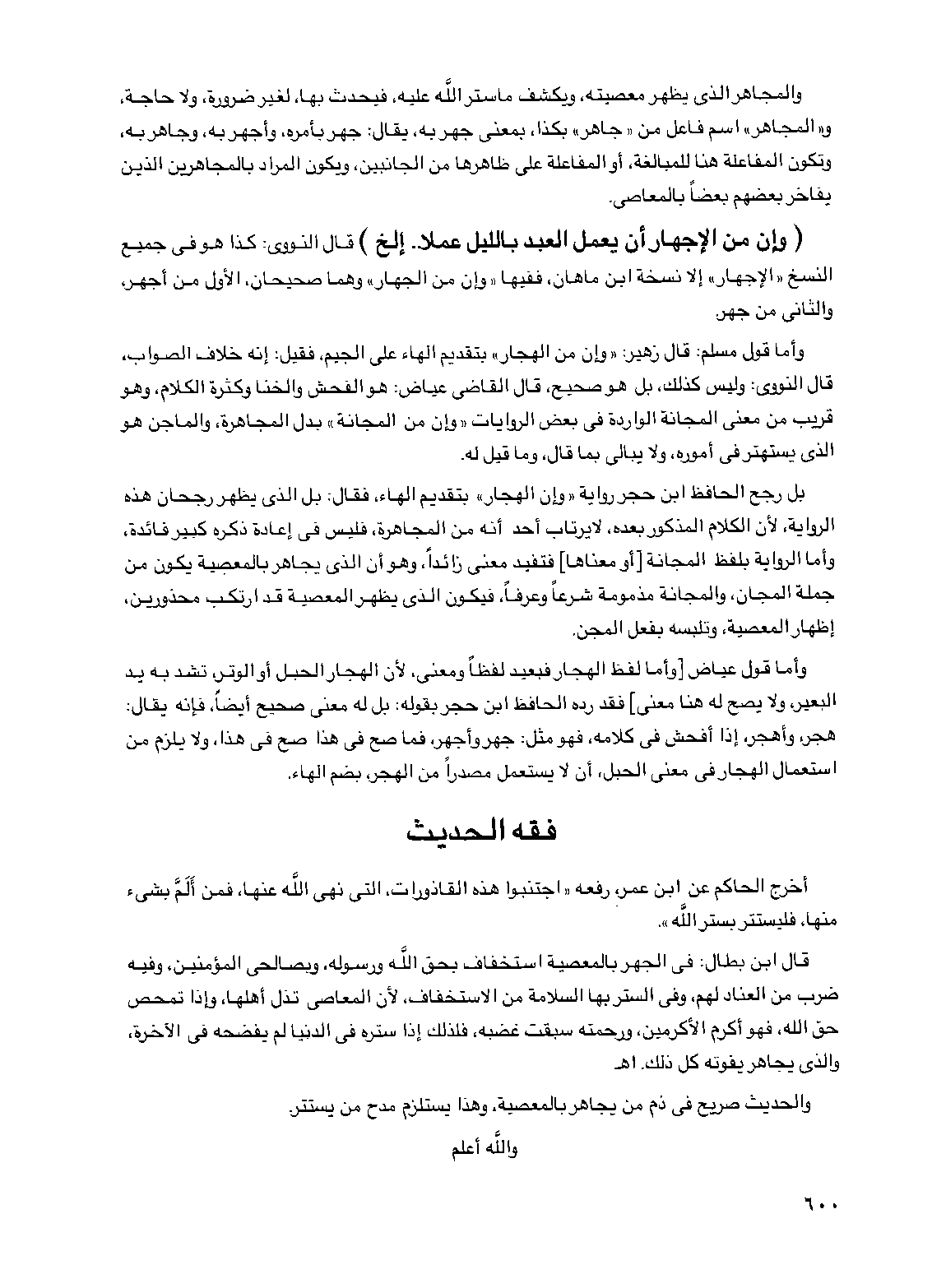 بل رجح الحافظ ابن حجر رواية "وإن الهجار" بتقديم الهاء فقال بل الذي يظهر رجحان هذه الرواية لأن الكلام المذكور بعده لا يرتاب أحد أنه من المجاهرة فليس في إعادة ذكره كبير فائدة وأما الرواية بلفظ المجانة [أو معناها] فتفيد معنى زائدا وهو أن الذي يجاهر بالمعصية يكون من جملة المجان والمجانة مذمومة شرعا وعرفا فيكون الذي يظهر المعصية قد ارتكب محذورين إظهار المعصية وتلبسه بفعل المجن