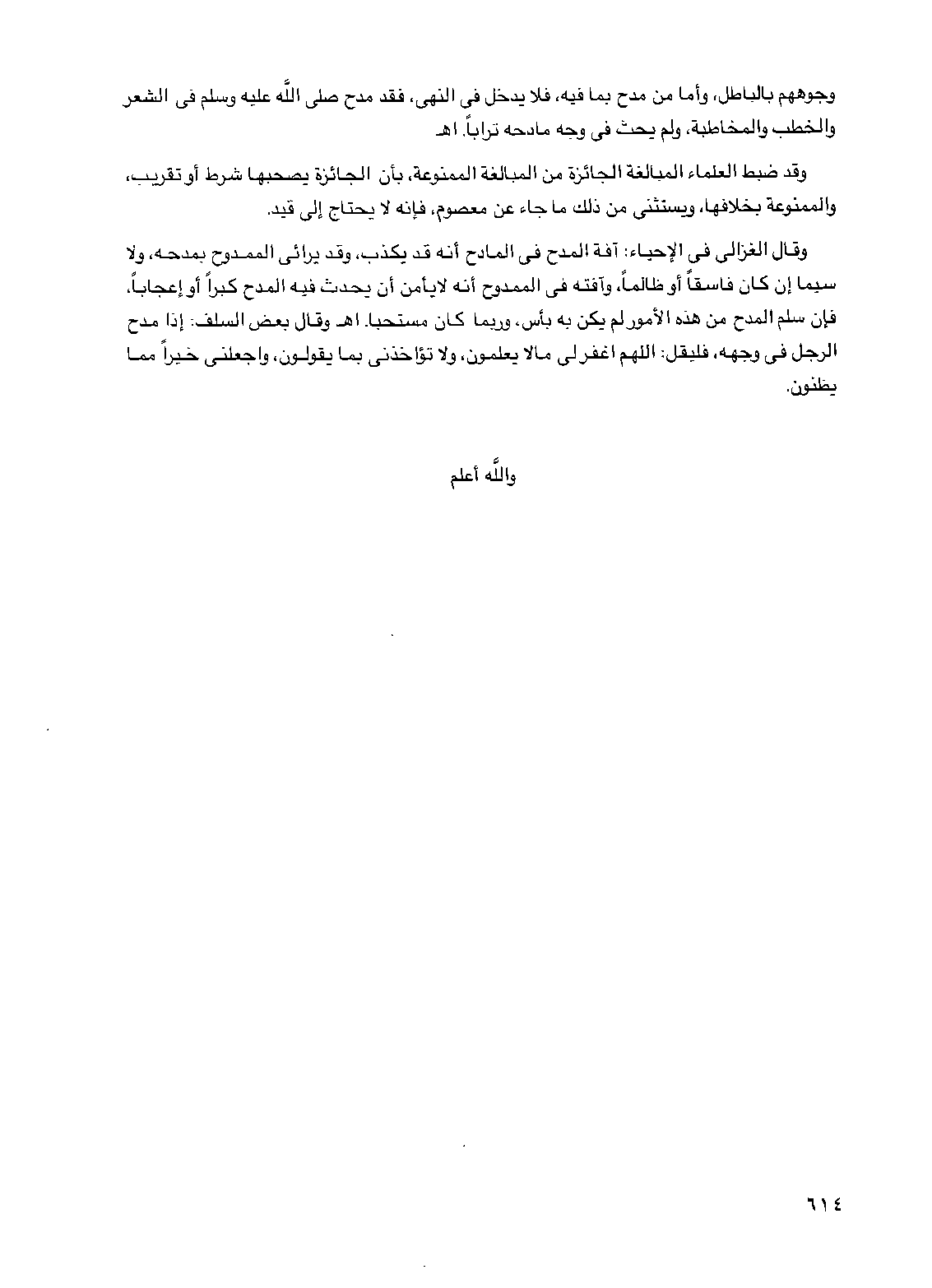 وقال الغزالي في الإحياء آفة المدح في المادح أنه قد يكذب وقد يرائي الممدوح بمدحه ولا سيما إن كان فاسقا أو ظالما وآفته في الممدوح أنه لا يأمن أن يحدث فيه المدح كبرا أو إعجابا فإن سلم المدح من هذه الأمور لم يكن به بأس وربما كان مستحبا اهـ وقال بعض السلف إذا مدح الرجل في وجهه فليقل اللهم اغفر لي ما لا يعلمون ولا تؤاخذني بما يقولون واجعلني خيرا مما يظنون