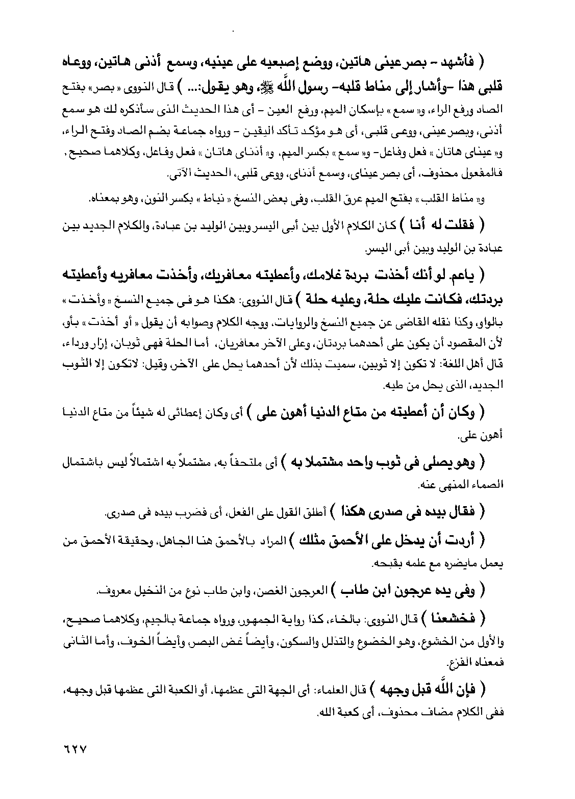 (فأشهد بصر عيني هاتين ووضع إصبعيه على عينيه وسمع أذني هاتين ووعاه قلبي هذا وأشار إلى مناط قلبه رسول الله صلى الله عليه وسلم وهو يقول ... ) قال النووي "بصر" بفتح الصاد ورفع الراء و"سمع" بإسكان الميم ورفع العين أي هذا الحديث الذي سأذكره لك هو سمع أذني وبصر عيني ووعي قلبي أي هو مؤكد تأكد اليقين ورواه جماعة بضم الصاد وفتح الراء و"عيناي هاتان" فعل وفاعل و"سمع" بكسر الميم و"أذناي هاتان" فعل وفاعل وكلاهما صحيح فالمفعول محذوف أي بصر عيناي وسمع أذناي ووعي قلبي الحديث الآتي
