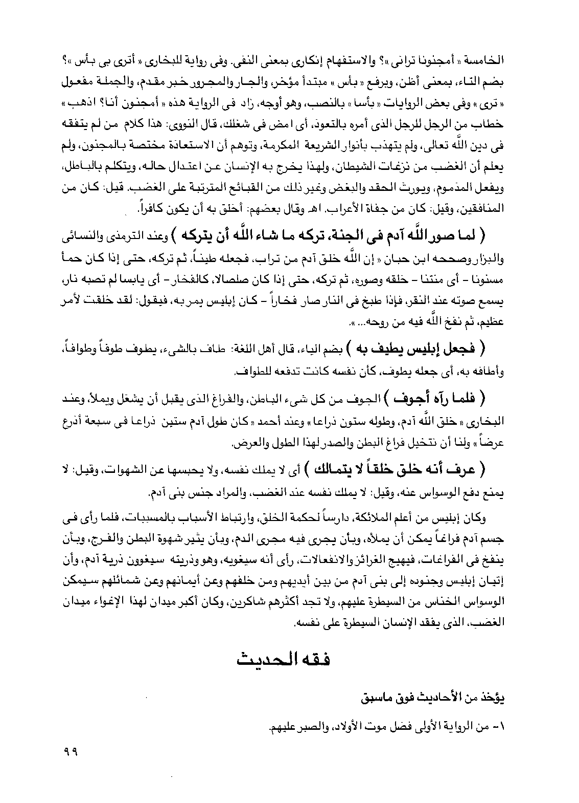 وكان إبليس من أعلم الملائكة دارسا لحكمة الخلق وارتباط الأسباب بالمسببات فلما رأى في جسم آدم فراغا يمكن أن يملأه وبأن يجري فيه مجرى الدم وبأن يثير شهوة البطن والفرج وبأن ينفخ في الفراغات فيهيج الغرائز والانفعالات رأي أنه سيغويه وهو وذريته سيغوون ذرية آدم وأن إتيان إبليس وجنوده إلى بني آدم من بين أيديهم ومن خلفهم وعن أيمانهم وعن شمائلهم سيمكن الوسواس الخناس من السيطرة عليهم ولا تجد أكثرهم شاكرين وكان أكبر ميدان لهذا الإغواء ميدان الغضب الذي يفقد الإنسان السيطرة على نفسه