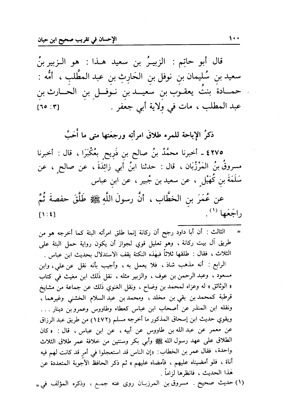 4275 - أَخْبَرَنَا مُحَمَّدُ بْنُ صَالِحِ بْنِ ذَرِيحٍ، بِعُكْبَرَا، قَالَ: أَخْبَرَنَا مَسْرُوقُ بْنُ الْمَرْزُبَانِ، قَالَ: حَدَّثَنَا ابْنُ أَبِي زَائِدَةَ، عَنْ صَالِحٍ، عَنْ سَلَمَةَ بْنِ كُهَيْلٍ، عَنْ سَعِيدِ بْنِ جُبَيْرٍ، عَنِ ابْنِ عَبَّاسٍ، عَنْ عُمَرَ بْنِ الْخَطَّابِ، «أَنُّ رَسُولَ اللَّهِ صَلَّى اللَّهُ عَلَيْهِ وَسَلَّمَ §طَلَّقَ حَفْصَةُ، ثُمَّ رَاجَعَهَا»
