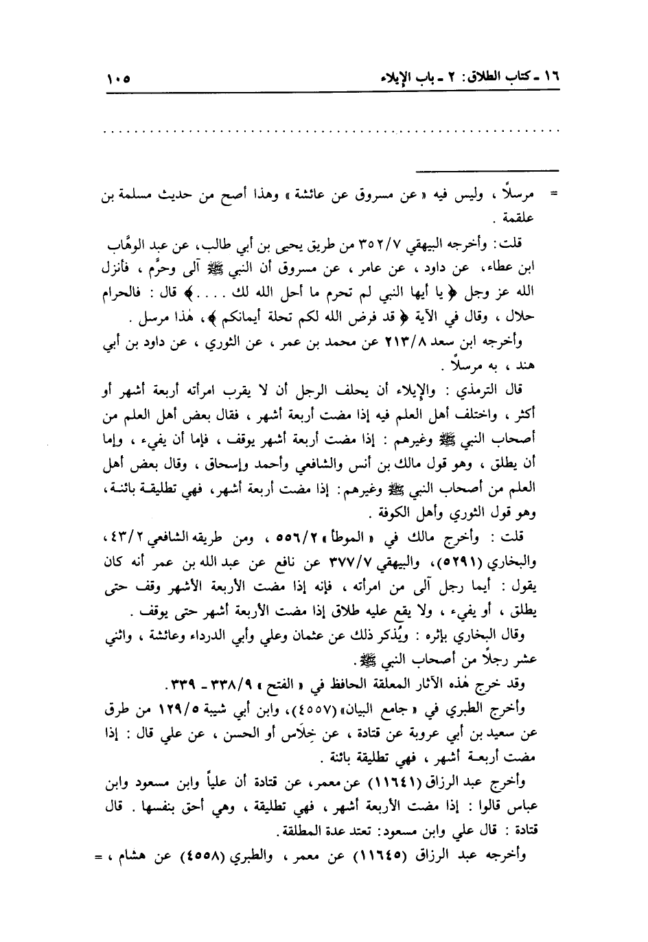 قلت: وأخرجه البيهقي 7/352 من طريق يحيى بن أبي طالب، عن عبد الوهَّاب ابن عطاء، عن داود، عن عامر، عن مسروق أن النبي صلى الله عليه وسلم آلى وحرَّم، فأنزل الله عز وجل {يَا أَيُّهَا النَّبِيُّ لِمَ تُحَرِّمُ مَا أَحَلَّ اللَّهُ لَكَ ... } قال: فالحرام حلال، وقال في الآية {قَدْ فَرَضَ اللَّهُ لَكُمْ تَحِلَّةَ أَيْمَانِكُمْ} ، هذا مرسل.