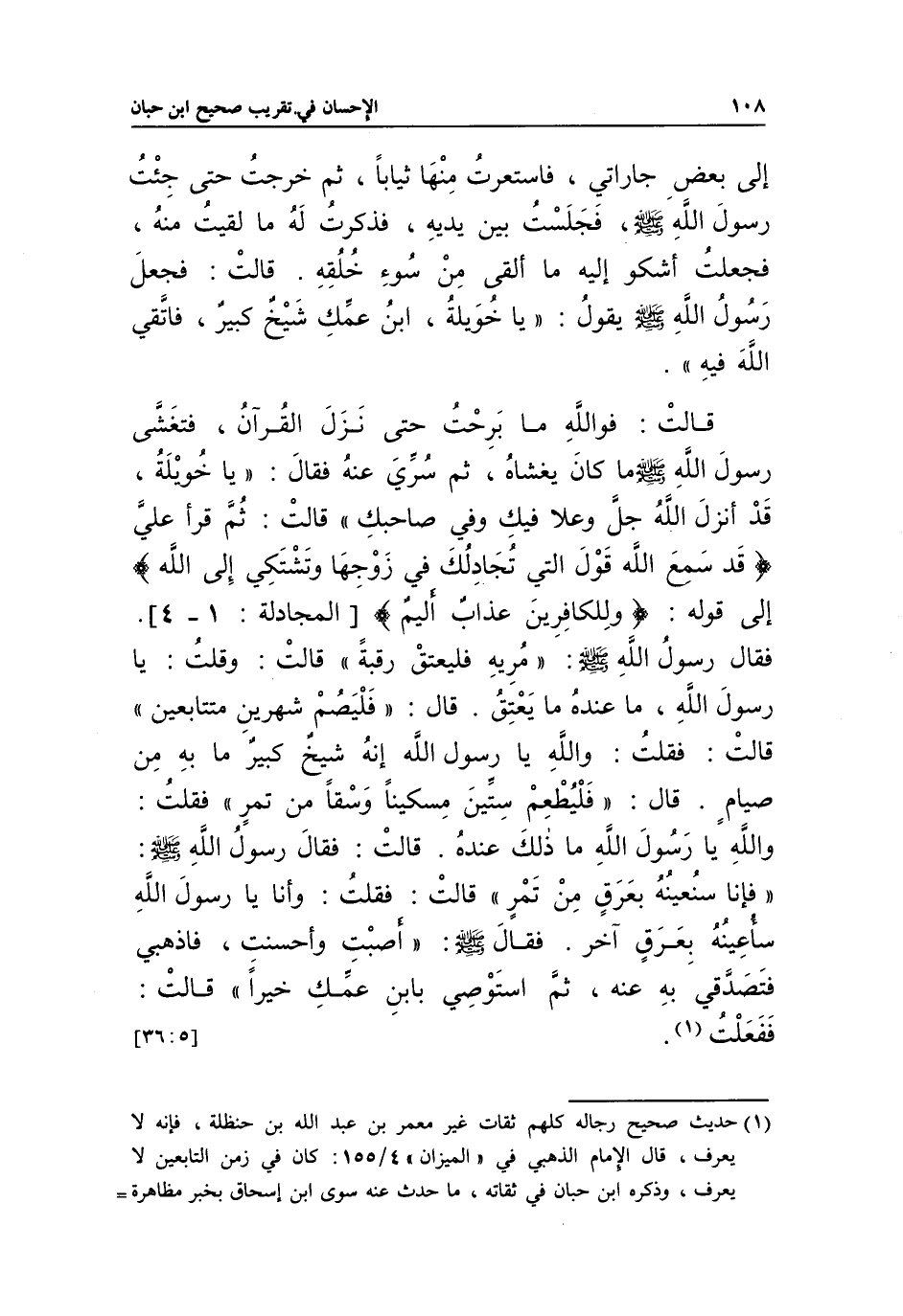 إِلَى بَعْضِ جَارَاتِي، فَاسْتَعَرْتُ مِنْهَا ثِيَابًا، ثُمَّ خَرَجْتُ حَتَّى جِئْتُ رَسُولَ اللَّهِ صَلَّى اللَّهُ عَلَيْهِ وَسَلَّمَ، فَجَلَسْتُ بَيْنَ يَدَيْهِ، فَذَكَرْتُ لَهُ مَا لَقِيتُ مِنْهُ، فَجَعَلْتُ أَشْكُو إِلَيْهِ مَا أَلْقَى مِنْ سُوءِ خُلُقِهِ، قَالَتْ: فَجَعَلَ رَسُولُ اللَّهِ صَلَّى اللَّهُ عَلَيْهِ وَسَلَّمَ يَقُولُ: "يَا خُوَيْلَةُ، ابْنُ عَمِّكِ شَيْخٌ كَبِيرٌ، فَاتَّقِي اللَّهَ فِيهِ".