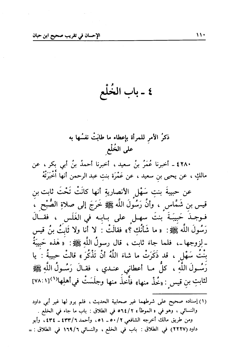 عَنْ حَبِيبَةَ بِنْتِ سَهْلٍ الْأَنْصَارِيَّةِ أَنَّهَا كَانَتْ تَحْتَ ثَابِتِ بْنِ قَيْسِ بْنِ شَمَّاسٍ، وَإِنَّ رَسُولَ اللَّهِ صَلَّى اللَّهُ عَلَيْهِ وَسَلَّمَ خَرَجَ إِلَى صَلَاةِ الصُّبْحِ، فَوَجَدَ حَبِيبَةَ بِنْتَ سَهْلٍ عَلَى بَابِهِ فِي الْغَلَسِ، فَقَالَ رَسُولُ اللَّهِ صَلَّى اللَّهُ عَلَيْهِ وَسَلَّمَ: "مَا شَأْنُكِ؟ " فَقَالَتْ: لَا أَنَا وَلَا ثَابِتُ بْنُ قَيْسٍ –لِزَوْجِهَا-، فَلَمَّا جَاءَ ثَابِتٌ، قَالَ رَسُولُ اللَّهِ صَلَّى اللَّهُ عَلَيْهِ وَسَلَّمَ: "هَذِهِ حَبِيبَةُ بِنْتُ سَهْلٍ قَدْ ذَكَرَتْ مَا شَاءَ اللَّهُ أَنْ تَذْكُرَ" قَالَتْ حَبِيبَةُ: يَا رَسُولَ اللَّهِ، كُلُّ مَا أَعْطَانِي عِنْدِي، فَقَالَ رَسُولُ اللَّهِ صَلَّى اللَّهُ عَلَيْهِ وَسَلَّمَ لِثَابِتِ بْنِ قَيْسٍ: "خُذْ مِنْهَا" فَأَخَذَ منها وجلست في أهلها (1) .