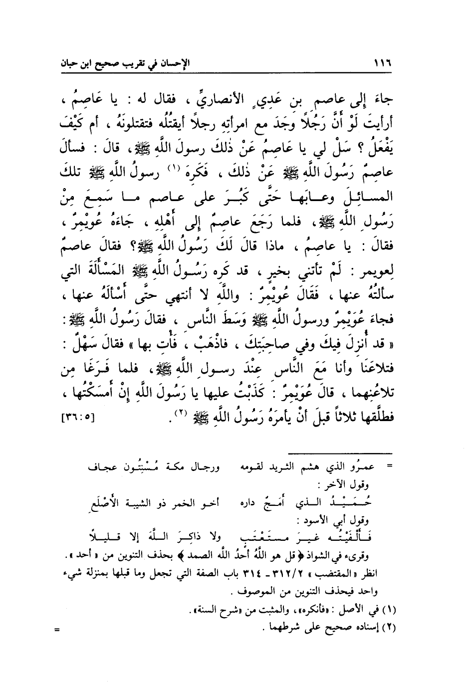 جَاءَ إِلَى عَاصِمِ بْنِ عَدِيٍّ الْأَنْصَارِيِّ، فَقَالَ لَهُ: يَا عَاصِمُ، أَرَأَيْتَ لَوَ أَنَّ رَجُلًا وَجَدَ مَعَ امْرَأَتِهِ رَجُلًا أَيَقْتُلُهُ فَتَقْتُلُونَهُ، أَمْ كَيْفَ يَفْعَلُ؟ سَلْ لِي يَا عَاصِمُ عَنْ ذَلِكَ رَسُولَ اللَّهِ صَلَّى اللَّهُ عَلَيْهِ وَسَلَّمَ، قَالَ: فَسَأَلَ عَاصِمُ رَسُولَ اللَّهِ صَلَّى اللَّهُ عَلَيْهِ وَسَلَّمَ عَنْ ذَلِكَ، فَكَرِهَ (¬1) رَسُولُ اللَّهِ صَلَّى اللَّهُ عَلَيْهِ وَسَلَّمَ تِلْكَ الْمَسَائِلَ وَعَابَهَا، حَتَّى كَبُرَ عَلَى عَاصِمٍ مَا سَمِعَ مِنْ رَسُولِ اللَّهِ صَلَّى اللَّهُ عَلَيْهِ وَسَلَّمَ، فَلَمَّا رَجَعَ عَاصِمٌ إِلَى أَهْلِهِ، جَاءَهُ عُوَيْمِرٌ، فَقَالَ: يَا عَاصِمُ، مَاذَا قَالَ لَكَ رَسُولُ اللَّهِ صَلَّى اللَّهُ عَلَيْهِ وَسَلَّمَ؟ فَقَالَ عَاصِمٌ لِعُوَيْمِرٍ: لَمْ تَأْتِنِي بِخَيْرٍ، قَدْ كَرِهَ رَسُولُ اللَّهِ صَلَّى اللَّهُ عَلَيْهِ وَسَلَّمَ الْمَسْأَلَةَ الَّتِي سَأَلْتُهُ عَنْهَا، فَقَالَ عُوَيْمِرٌ: وَاللَّهِ لَا أَنْتَهِي حَتَّى أَسْأَلُهُ عَنْهَا، فَجَاءَ عُوَيْمِرٌ وَرَسُولُ اللَّهِ صَلَّى اللَّهُ عَلَيْهِ وَسَلَّمَ وَسَطَ النَّاسِ، فَقَالَ رَسُولُ اللَّهِ صَلَّى اللَّهُ عَلَيْهِ وَسَلَّمَ: «قَدْ أُنْزِلَ فِيكَ وَفِي صَاحِبَتِكَ، فَاذْهَبْ فَأْتِ بِهَا» ، فَقَالَ سَهْلٌ: فَتَلَاعَنَا وَأَنَا مَعَ النَّاسِ عِنْدَ رَسُولِ اللَّهِ صَلَّى اللَّهُ عَلَيْهِ وَسَلَّمَ، فَلَمَّا فَرَغَا مِنْ تَلَاعُنِهِمَا، قَالَ عُوَيْمِرٌ: كَذَبْتُ عَلَيْهَا يَا رَسُولَ اللَّهِ إِنْ أَمْسَكْتُهَا، فَطَلَّقَهَا ثَلَاثًا قَبْلَ أَنْ يَأْمُرُهُ رَسُولُ اللَّهِ صَلَّى اللَّهُ عَلَيْهِ وَسَلَّمَ (¬2) . [5: 36]