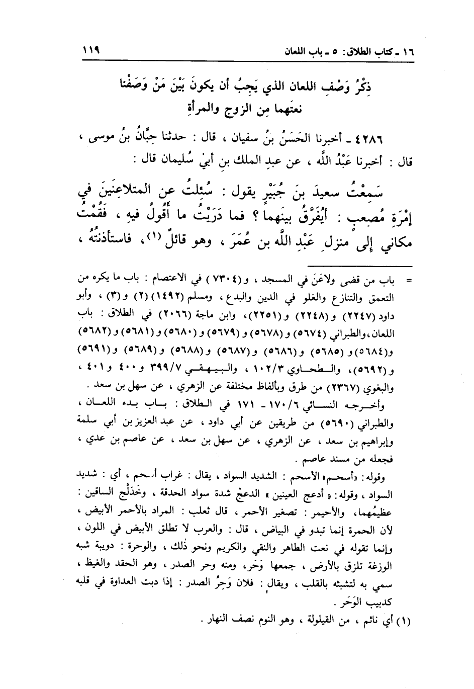 4286 - أَخْبَرَنَا الْحَسَنُ بْنُ سُفْيَانَ، قَالَ: حَدَّثَنَا حَبَّانُ بْنُ مُوسَى، قَالَ: أَخْبَرَنَا عَبْدُ اللَّهِ، عَنْ عَبْدِ الْمَلِكِ بْنِ أَبِي سُلَيْمَانَ، قَالَ: سَمِعْتُ سَعِيدَ بْنَ جُبَيْرٍ يَقُولُ: سُئِلْتُ عَنِ الْمُتَلَاعِنِينَ فِي إِمْرَةِ مُصْعَبٍ، أَيُفَرَّقُ بَيْنَهُمَا؟، فَمَا دَرَيْتُ مَا أَقُولُ فِيهِ، فَقُمْتُ مَكَانِي إِلَى مَنْزِلِ عَبْدِ اللَّهِ بْنِ عُمَرَ، وَهُوَ قَائِلٌ (¬1) ، فَاسْتَأْذَنْتُهُ،