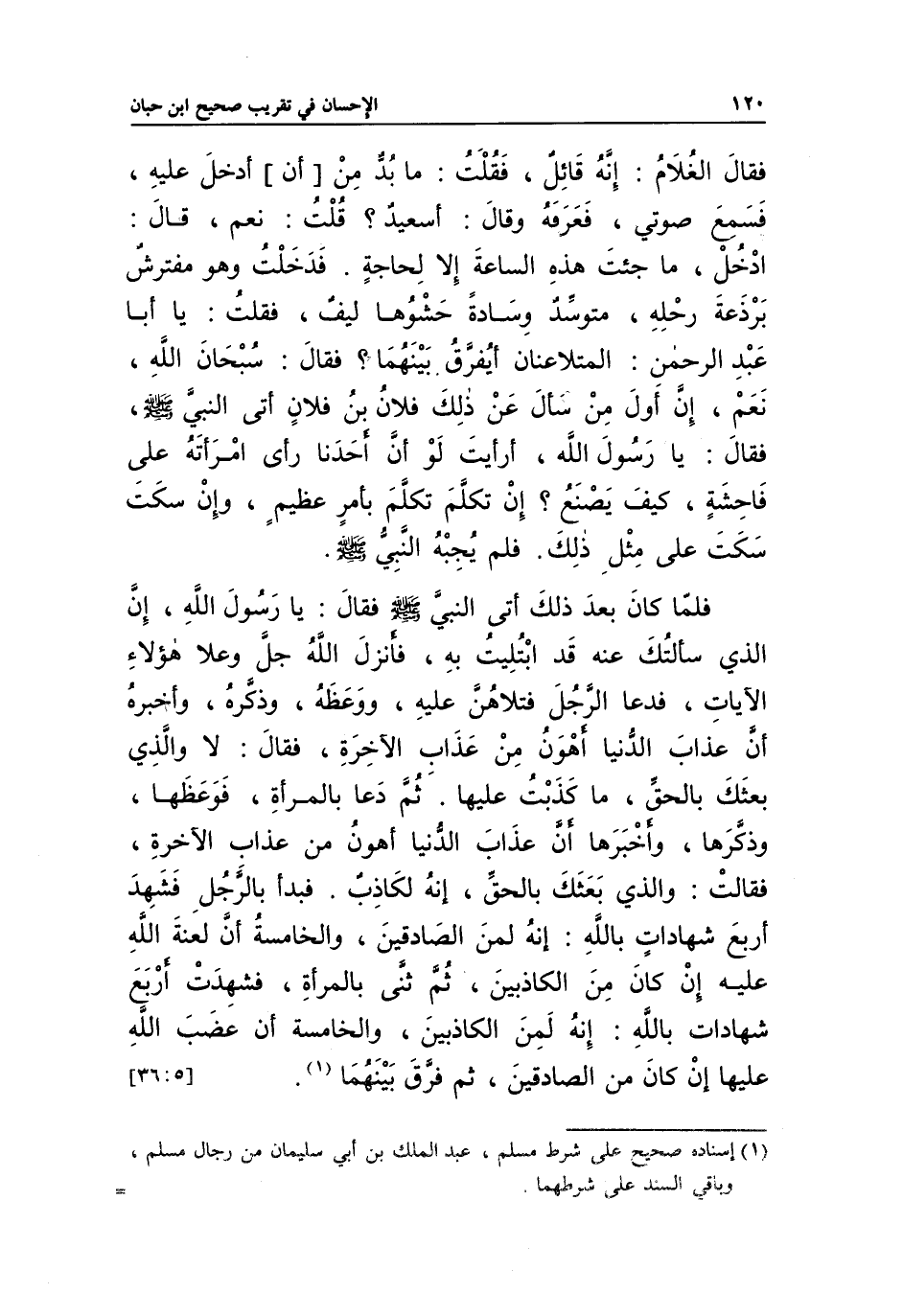 فَقَالَ الْغُلَامُ: إِنَّهُ قَائِلٌ، فَقُلْتُ: مَا بُدَّ مِنْ أَنْ أَدْخُلَ عَلَيْهِ فَسَمِعَ صَوْتِي، فَعَرَفَهُ، وَقَالَ: أَسَعِيدٌ؟، قُلْتُ: نَعَمْ، قَالَ: ادْخُلْ مَا جِئْتَ هَذِهِ السَّاعَةَ إِلَّا لِحَاجَةٍ، فَدَخَلْتُ، وَهُوَ مُفْتَرِشٌ بَرْذَعَةَ رَحْلِهِ مُتَوَسِّدٌ وِسَادَةً حَشْوهَا لِيفٌ، فَقُلْتُ: يَا أَبَا عَبْدِ الرَّحْمَنِ، الْمُتَلَاعِنَانِ، أَيُفَرَّقُ بَيْنَهُمَا، فَقَالَ: سُبْحَانَ اللَّهِ، نَعَمْ إِنَّ أَوَّلَ مَنْ سَأَلَ عَنْ ذَلِكَ فُلَانُ بْنُ فُلَانٍ، أَتَى النَّبِيَّ صَلَّى اللَّهُ عَلَيْهِ وَسَلَّمَ، فَقَالَ: يَا رَسُولَ اللَّهِ، أَرَأَيْتَ لَوْ أَنَّ أَحَدَنَا رَأَى امْرَأَتَهُ عَلَى فَاحِشَةٍ كَيْفَ يَصْنَعُ؟ إِنْ تَكَلَّمَ تَكَلَّمَ بِأَمْرٍ عَظِيمٍ، وَإِنْ سَكَتَ سَكَتَ عَلَى مِثْلِ ذَلِكَ، فَلَمْ يُجِبْهُ النَّبِيُّ صَلَّى اللَّهُ عَلَيْهِ وَسَلَّمَ، فَلَمَّا كَانَ بَعْدُ ذَلِكَ أَتَى النَّبِيَّ صَلَّى اللَّهُ عَلَيْهِ وَسَلَّمَ، فَقَالَ: يَا رَسُولَ اللَّهِ: إِنَّ الَّذِي سَأَلْتُكَ عَنْهُ قَدِ ابْتُلِيتُ بِهِ، «فَأَنْزَلَ اللَّهُ جَلَّ وَعَلَا هَؤُلَاءِ الْآيَاتِ فَدَعَا الرَّجُلَ، فَتَلَاهُنَّ عَلَيْهِ وَوَعَظَهُ وَذَكَّرَهُ، وَأَخْبَرَهُ أَنَّ عَذَابَ الدُّنْيَا أَهْوَنُ مِنْ عَذَابِ الْآخِرَةِ» ، فَقَالَ: لَا وَالَّذِي بَعَثَكَ بِالْحَقِّ، مَا كَذَبْتُ عَلَيْهَا، «ثُمَّ دَعَا بِالْمَرْأَةِ فَوَعَظَهَا وَذَكَّرَهَا، وَأَخْبَرَهَا أَنَّ عَذَابَ الدُّنْيَا أَهْوَنُ مِنْ عَذَابِ الْآخِرَةِ» ، فَقَالَتْ: وَالَّذِي بَعَثَكَ بِالْحَقِّ إِنَّهُ لَكَاذِبٌ، «فَبَدَأَ بِالرَّجُلِ، فَشَهِدَ أَرْبَعَ شَهَادَاتٍ بِاللَّهِ إِنَّهُ لِمَنِ الصَّادِقِينَ وَالْخَامِسَةُ أَنَّ لَعْنَةَ اللَّهِ عَلَيْهِ إِنْ كَانَ مِنَ الْكَاذِبِينَ، ثُمَّ ثَنَّى بِالْمَرْأَةِ فَشَهِدَتْ أَرْبَعَ شَهَادَاتٍ بِاللَّهِ إِنَّهُ لِمَنِ الْكَاذِبِينَ وَالْخَامِسَةُ أَنَّ غَضِبَ اللَّهِ عَلَيْهَا إِنْ كَانَ مِنَ الصَّادِقِينَ، ثُمَّ فَرَّقَ بَيْنَهُمَا» (¬1) . [5: 36]