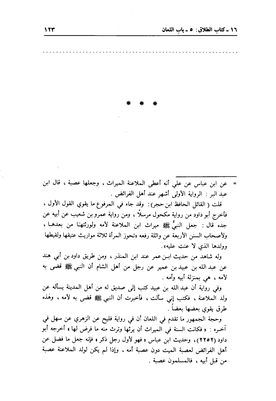 = عن ابن عباس عن علي أنه أعطى الملاعنة الميراث، وجعلها عصبة، قال ابن عبد البر: الرواية الأولى أشهر عند أهل الفرائض.