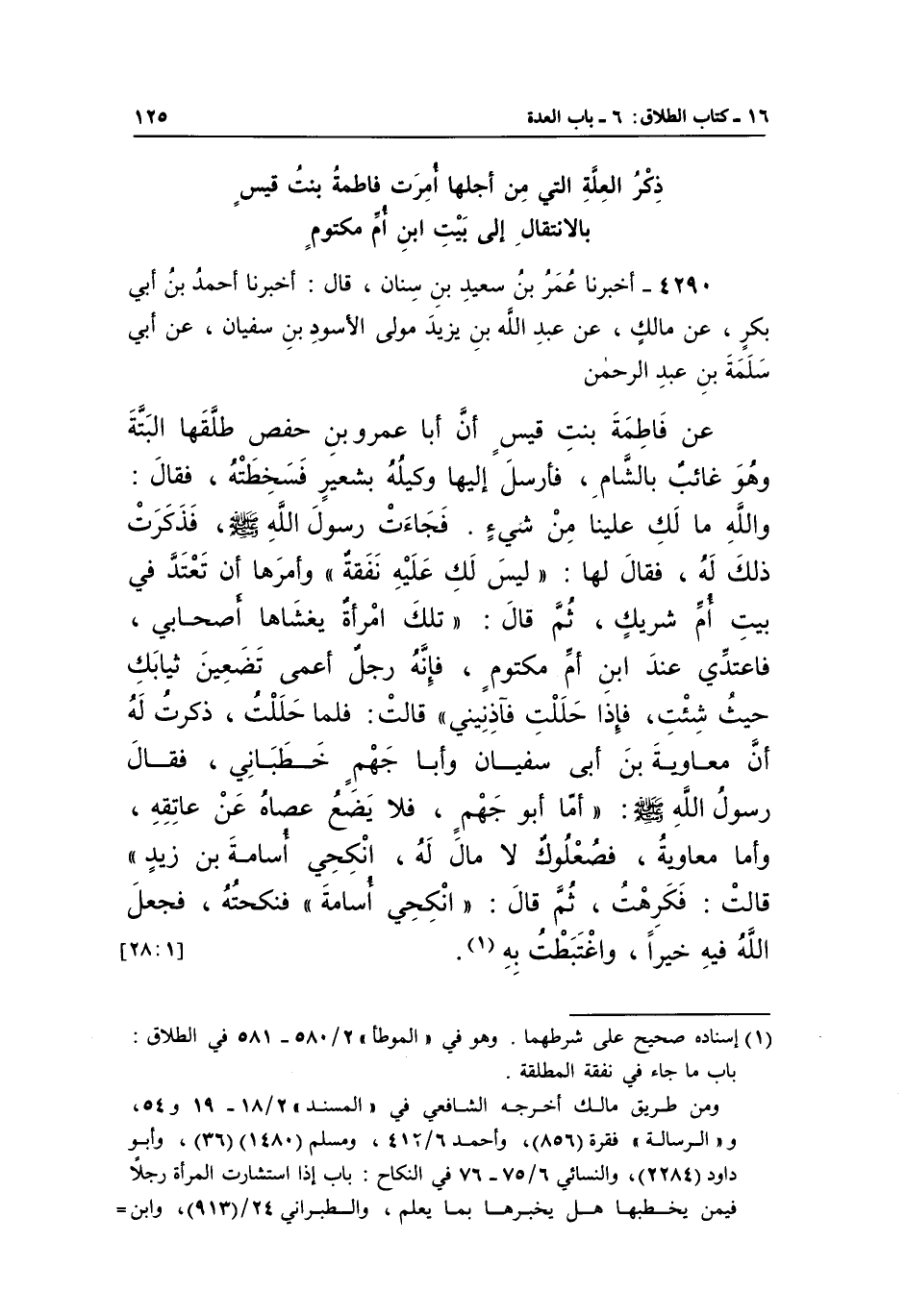 4290 - أَخْبَرَنَا عُمَرُ بْنُ سَعِيدِ بْنِ سِنَانَ، قَالَ: أَخْبَرَنَا أَحْمَدُ بْنُ أَبِي بَكْرٍ، عَنْ مَالِكٍ، عَنْ عَبْدِ اللَّهِ بْنِ يَزِيدَ مَوْلَى الْأَسْوَدِ بْنِ سُفْيَانَ، عَنْ أَبِي سَلَمَةَ بْنِ عَبْدِ الرَّحْمَنِ، عَنْ فَاطِمَةَ بِنْتِ قَيْسٍ، أَنَّ أَبَا عَمْرِو بْنِ حَفْصٍ طَلَّقَهَا الْبَتَّةَ وَهُوَ غَائِبٌ بِالشَّامِ، فَأَرْسَلَ إِلَيْهَا وَكِيلَهُ بِشَعِيرٍ، فَسَخِطَتْهُ، فَقَالَ: وَاللَّهِ مَا لَكَ عَلَيْنَا مِنْ شَيْءٍ، فَجَاءَتْ رَسُولَ اللَّهِ صَلَّى اللَّهُ عَلَيْهِ وَسَلَّمَ فَذَكَرَتْ ذَلِكَ لَهُ، فَقَالَ لَهَا: «لَيْسَ لَكِ عَلَيْهِ نَفَقَةٌ» ، وَأَمَرَهَا أَنْ تَعْتَدَّ فِي بَيْتِ أُمِّ شَرِيكٍ، ثُمَّ قَالَ: «تِلْكَ امْرَأَةٌ يَغْشَاهَا أَصْحَابِي، فَاعْتَدِّي عِنْدَ ابْنِ أُمِّ مَكْتُومٍ، فَإِنَّهُ رَجُلٌ أَعْمَى تَضَعِينَ ثِيَابَكِ حَيْثُ شِئْتِ، فَإِذَا حَلَلْتِ فَآذِنِينِي» ، قَالَتْ: فَلَمَّا حَلَلْتُ ذَكَرْتُ لَهُ أَنَّ مُعَاوِيَةَ بْنَ أَبِي سُفْيَانَ وَأَبَا جَهْمٍ خَطَبَانِي، فَقَالَ رَسُولُ اللَّهِ صَلَّى اللَّهُ عَلَيْهِ وَسَلَّمَ: «أَمَّا أَبُو جَهْمٍ فَلَا يَضَعُ عَصَاهُ عَنْ عَاتِقِهِ، وَأَمَّا مُعَاوِيَةُ فَصُعْلُوكٌ لَا مَالَ لَهُ، انْكِحِي أُسَامَةَ بْنَ زَيْدٍ» ، قَالَتْ: فَكَرِهْتُ، ثُمَّ قَالَ: «انْكِحِي أُسَامَةَ» ، فَنَكَحْتُهُ، فَجَعَلَ اللَّهُ فِيهِ خَيْرًا وَاغْتَبَطْتُ بِهِ (¬1) . [1: 28]