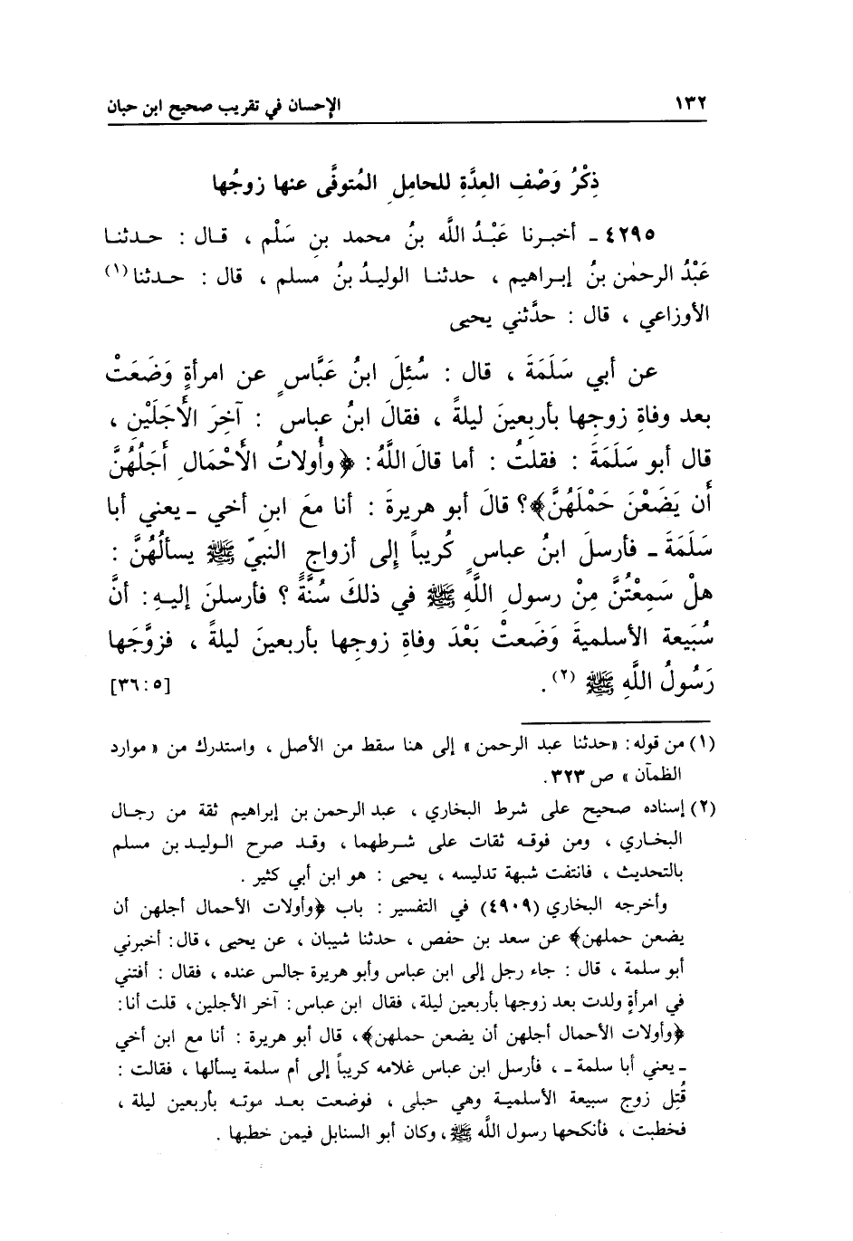 4295 - أَخْبَرَنَا عَبْدُ اللَّهِ بْنُ مُحَمَّدِ بْنِ سَلْمٍ، قَالَ: حَدَّثَنَا عَبْدُ الرَّحْمَنِ بْنُ إِبْرَاهِيمَ، حَدَّثَنَا الْوَلِيدُ بْنُ مُسْلِمٍ، قَالَ: حَدَّثَنَا (¬1) الْأَوْزَاعِيُّ، قَالَ: حَدَّثَنِي يَحْيَى، عَنْ أَبِي سَلَمَةَ قَالَ: سُئِلَ ابْنُ عَبَّاسٍ عَنِ امْرَأَةٍ وَضَعَتْ بَعْدَ وَفَاةِ زَوْجِهَا بِأَرْبَعِينَ لَيْلَةً، فَقَالَ ابْنُ عَبَّاسٍ: «آخِرَ الْأَجَلَيْنِ» ، قَالَ أَبُو سَلَمَةَ: فَقُلْتُ: أَمَا قَالَ اللَّهُ: {وَأُولَاتُ الْأَحْمَالِ أَجَلُهُنَّ أَنْ يَضَعْنَ حَمْلَهُنَّ} ؟ قَالَ أَبُو هُرَيْرَةَ: «أَنَا مَعَ ابْنِ أَخِي» - يَعْنِي أَبَا سَلَمَةَ - فَأَرْسَلَ ابْنُ عَبَّاسٍ كُرَيْبًا إِلَى أَزْوَاجِ النَّبِيِّ صَلَّى اللَّهُ عَلَيْهِ وَسَلَّمَ، يَسْأَلَهُنَّ، هَلْ سَمِعْتُنَّ مِنْ رَسُولِ اللَّهِ صَلَّى اللَّهُ عَلَيْهِ وَسَلَّمَ فِي ذَلِكَ سُنَّةً؟، فَأَرْسَلْنَ إِلَيْهِ «أَنَّ سُبَيْعَةَ الْأَسْلَمِيَّةَ وَضَعَتْ بَعْدَ وَفَاةِ زَوْجِهَا بِأَرْبَعِينَ لَيْلَةً، فَزَوَّجَهَا رَسُولُ اللَّهِ صَلَّى اللَّهُ عَلَيْهِ وَسَلَّمَ» (¬2) . [5: 36]