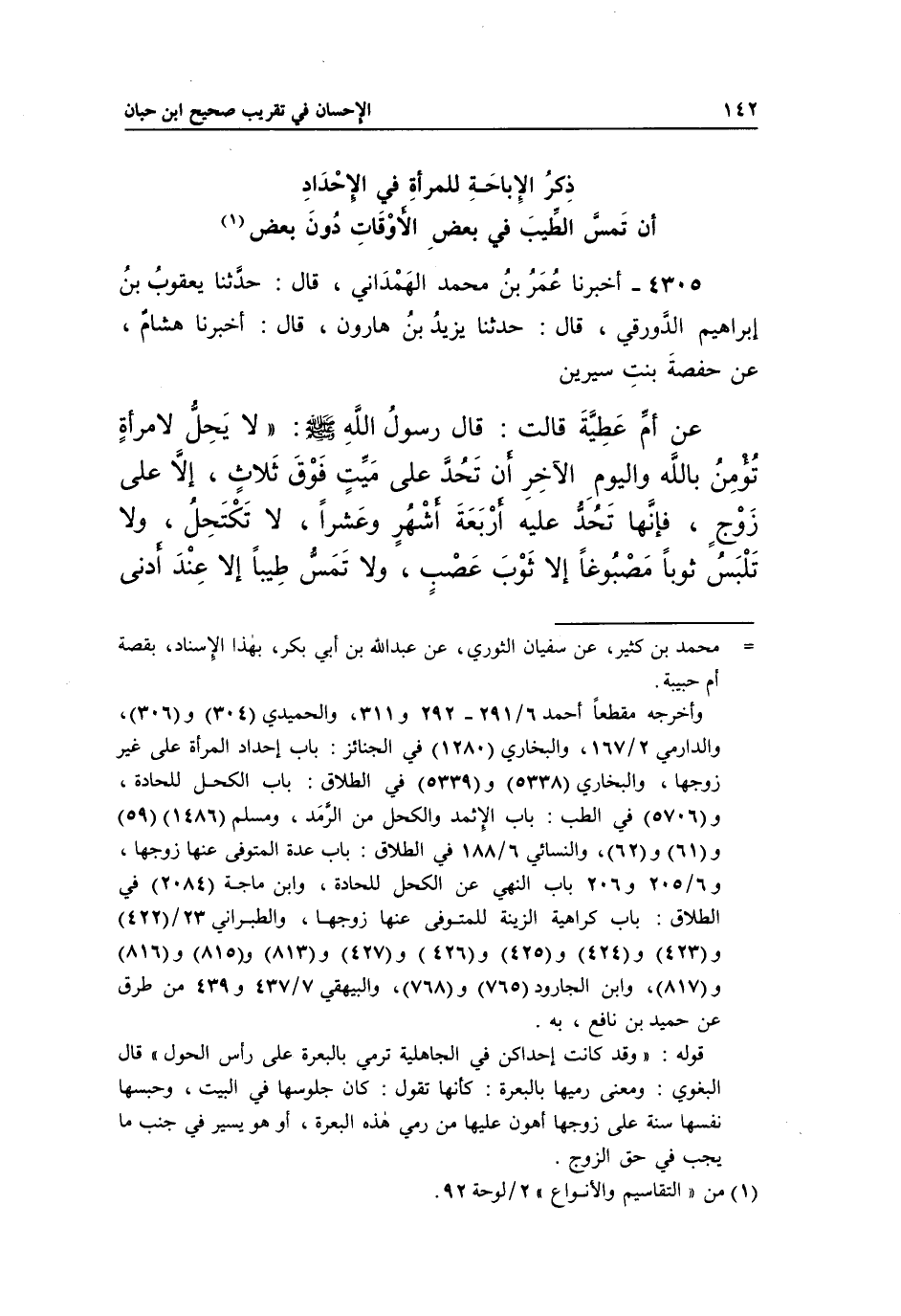 4305 - أَخْبَرَنَا عُمَرُ بْنُ مُحَمَّدٍ الْهَمْدَانِيُّ، قَالَ: حَدَّثَنَا يَعْقُوبُ بْنُ إِبْرَاهِيمَ الدَّوْرَقِيُّ، قَالَ: حَدَّثَنَا يَزِيدُ بْنُ هَارُونَ، قَالَ: أَخْبَرَنَا هِشَامٌ، عَنْ حَفْصَةَ بِنْتِ سِيرِينَ، عَنْ أُمِّ عَطِيَّةَ قَالَتْ: قَالَ رَسُولُ اللَّهِ صَلَّى اللَّهُ عَلَيْهِ وَسَلَّمَ: «لَا يَحِلُّ لِامْرَأَةٍ تُؤْمِنُ بِاللَّهِ وَالْيَوْمِ الْآخِرِ أَنْ تَحُدَّ عَلَى مَيِّتٍ فَوْقَ ثَلَاثٍ، إِلَّا عَلَى زَوْجٍ، فَإِنَّهَا تَحُدُّ عَلَيْهِ أَرْبَعَةَ أَشْهُرٍ وَعَشْرًا، لَا تَكْتَحِلُ، وَلَا تَلْبَسُ ثَوْبًا مَصْبُوغًا، إِلَّا ثَوْبَ عَصْبٍ، وَلَا تَمَسُّ طِيبًا إِلَّا عِنْدَ أَدْنَى