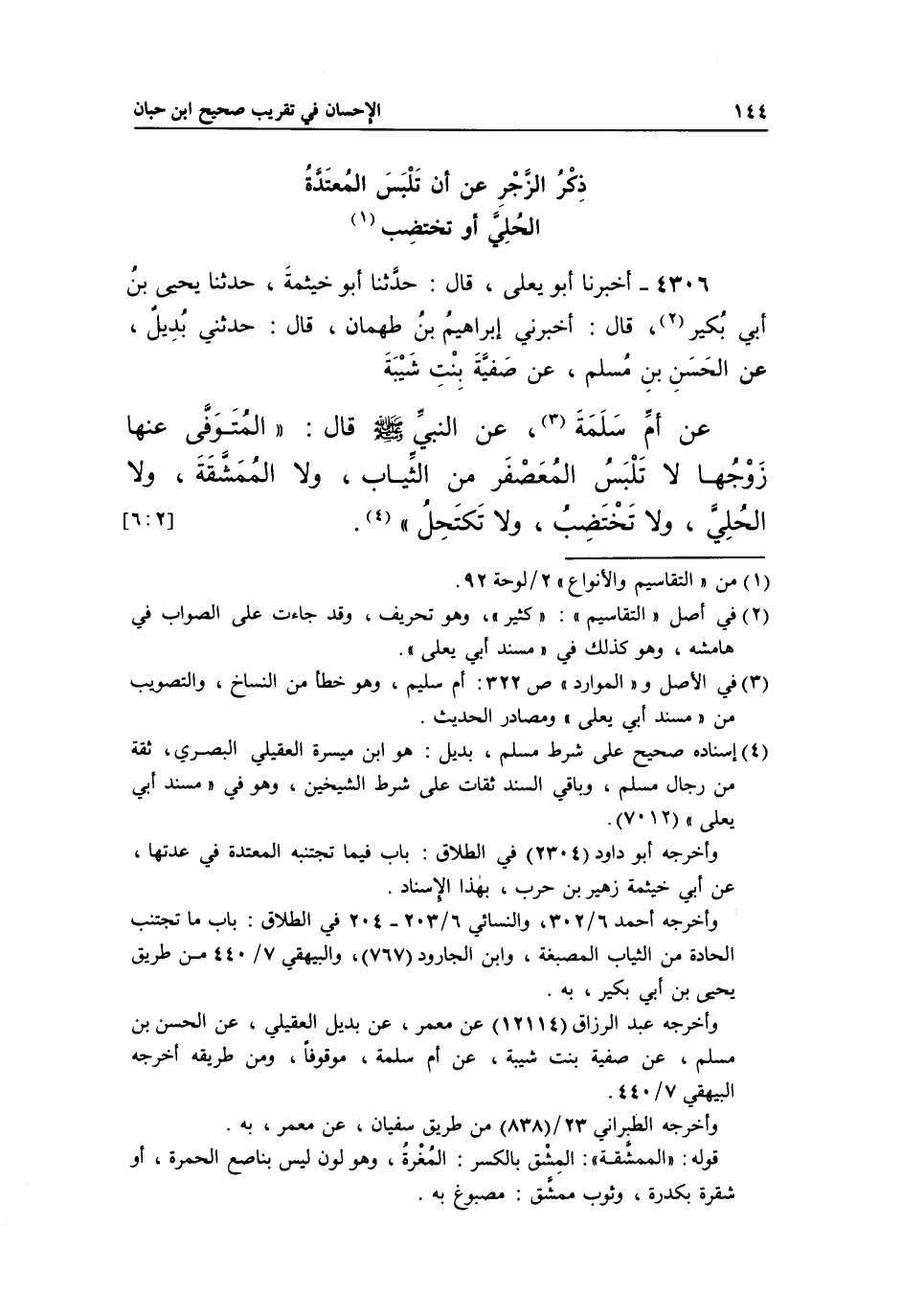 4306 - أَخْبَرَنَا أَبُو يَعْلَى قَالَ: حَدَّثَنَا أَبُو خَيْثَمَةَ، حَدَّثَنَا يَحْيَى بْنُ أَبِي بُكَيْرٍ (¬2) ، قَالَ: أَخْبَرَنِي إِبْرَاهِيمُ بْنُ طَهْمَانَ قَالَ: حَدَّثَنِي بُدَيْلٌ، عَنِ الْحَسَنِ بْنِ مُسْلِمٍ، عَنْ صَفِيَّةَ بِنْتِ شَيْبَةَ، عَنْ أُمِّ سَلَمَةَ (¬3) ، عَنِ النَّبِيِّ صَلَّى اللَّهُ عَلَيْهِ وَسَلَّمَ قَالَ: «الْمُتَوَفَّى عَنْهَا زَوْجُهَا لَا تَلْبَسُ الْمُعَصْفَرَ مِنَ الثِّيَابِ، وَلَا الْمُمَشَّقَةَ، وَلَا الْحُلِيَّ، وَلَا تَخْتَضِبُ وَلَا تَكْتَحِلُ» (¬4) . [2: 6]