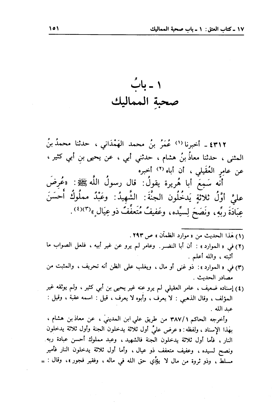 وأخرجه الحاكم 1/387 من طريق علي بن المديني، عن معاذ بن هشام، بهذا الإسناد، ولفظه: "عرض عليَّ أول ثلاثة يدخلون الجنة وأول ثلاثة يدخلون النار، فأما أول ثلاثة يدخلون الجنة فالشهيد، وَعَبْدٌ مَمْلُوكٌ أَحْسَنَ عِبَادَةَ رَبِّهِ وَنَصَحَ لِسَيِّدِهِ، وعفيف متعفف ذو عيال، وأما أول ثلاثة يدخلون النار فأمير مسلط، وذو ثروة من مال لا يؤدّي حق الله في ماله، وفقير فجور"، وقال:. . . . . . . . . . . . . . . . . . . . . . . . . . . . . . . . . .=