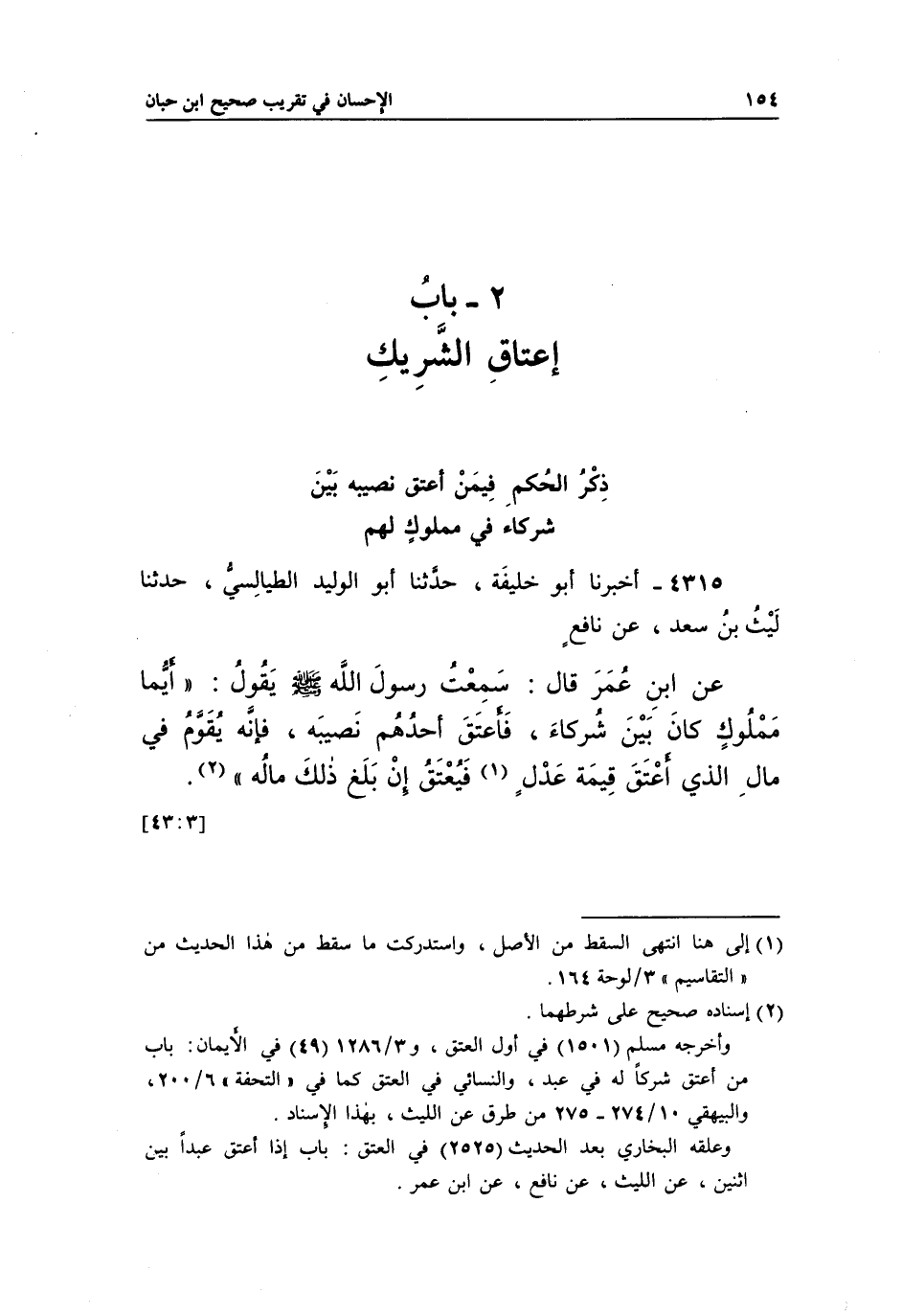 4315 - أَخْبَرَنَا أَبُو خَلِيفَةَ، حَدَّثَنَا أَبُو الْوَلِيدِ الطَّيَالِسِيُّ، حَدَّثَنَا لَيْثُ بْنُ سَعْدٍ، عَنْ نَافِعٍ عَنِ بْنَ عُمَرَ قَالَ: سَمِعْتُ رَسُولَ اللَّهِ صَلَّى اللَّهُ عَلَيْهِ وَسَلَّمَ يَقُولُ: "أَيُّمَا مَمْلُوكٍ كَانَ بَيْنَ شُرَكَاءَ، فَأَعْتَقَ أَحَدُهُمْ نَصِيبَهُ، فَإِنَّهُ يُقَوَّمُ فِي مَالِ الَّذِي أَعْتَقَ قِيمَةَ عَدْلٍ 1 فَيُعْتَقُ إِنْ بلغ ذلك ماله" 2