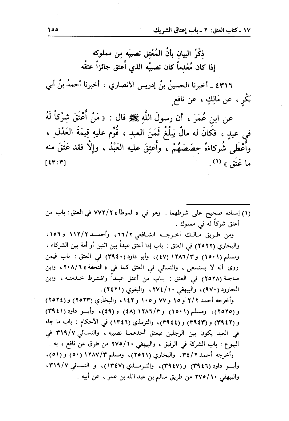 وأخرجه أحمد 2/2 و15 و77 و105 و142، والبخاري "2523" و"2524" و"2525"، ومسلم "1501" و3/1286 "48" و"49"، وأبو داود "3941" و"3942" و"3943" و"3944"، والترمذي "1386" في الأحكام: باب ما جاء في العبد يكون بين الرجلين فيعتق أحدهما نصيبه، والنسائي 7/319 في البيوع: باب الشركة في الرقيق، والبيهقي 10/275 من طرق عن نافع، به.