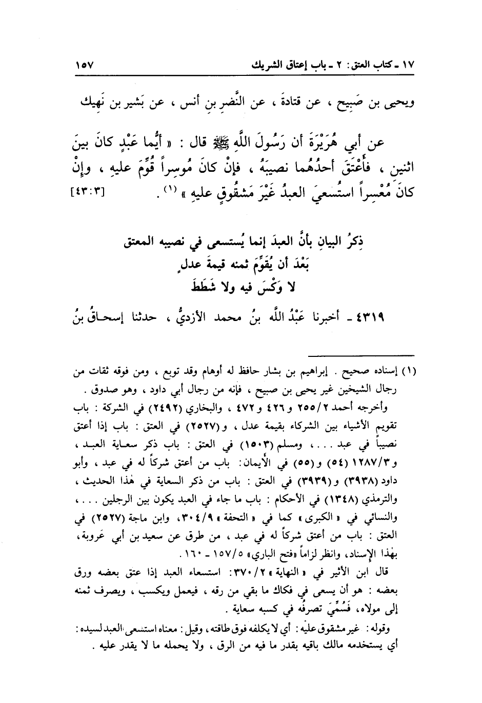وَيَحْيَى بْنُ صُبَيْحٍ، عَنْ قَتَادَةَ، عَنِ النَّضْرِ بْنِ أَنَسٍ، عَنْ بَشِيرِ بْنِ نَهِيكٍ عَنْ أَبِي هُرَيْرَةَ أَنَّ رَسُولَ اللَّهِ صَلَّى الله عَلَيْهِ وَسَلَّمَ قَالَ: "أَيُّمَا عَبْدٌ كَانَ بَيْنَ اثْنَيْنِ، فَأَعْتَقَ أَحَدُهُمَا نَصِيبَهُ، فَإِنْ كَانَ مُوسِرًا قُوِّمَ عَلَيْهِ، وَإِنْ كَانَ مُعْسِرًا اسْتُسْعِيَ الْعَبْدُ غير مشقوق عليه" 1