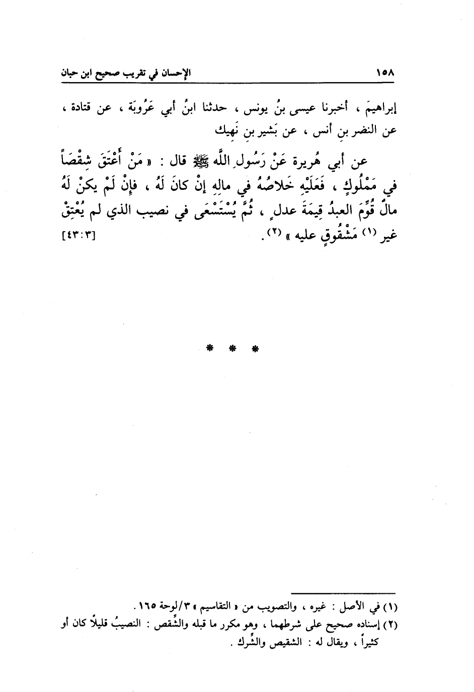 إِبْرَاهِيمَ، أَخْبَرَنَا عِيسَى بْنُ يُونُسَ، حَدَّثَنَا ابْنُ أَبِي عَرُوبَةَ، عَنْ قَتَادَةَ، عَنْ النَّضْرِ بْنِ أَنَسٍ، عَنْ بَشِيرِ بْنِ نَهِيكٍ عَنْ أَبِي هُرَيْرَةَ عَنْ رَسُولِ اللَّهِ صَلَّى اللَّهُ عَلَيْهِ وَسَلَّمَ قَالَ: "مَنْ أَعْتَقَ شِقْصًا فِي مَمْلُوكٍ، فَعَلَيْهِ خَلَاصُهُ فِي مَالِهِ إِنْ كَانَ لَهُ، فَإِنْ لَمْ يَكُنْ لَهُ مَالٌ قُوِّمَ الْعَبْدُ قِيمَةَ عَدْلٍ، ثُمَّ يُسْتَسْعَى فِي نَصِيبِ الَّذِي لم يعتق غير 1 مشقوق عليه" 2