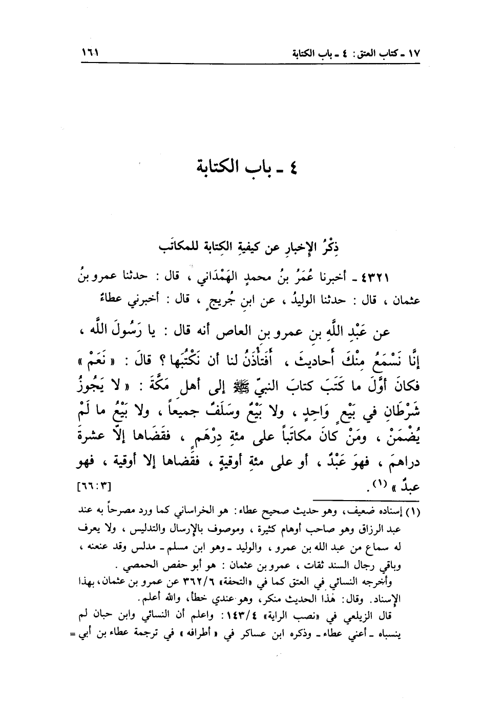 4321 - أَخْبَرَنَا عُمَرُ بْنُ مُحَمَّدٍ الْهَمْدَانِيُّ، قَالَ: حَدَّثَنَا عَمْرُو بْنُ عُثْمَانَ، قَالَ: حَدَّثَنَا الْوَلِيدُ، عَنِ ابْنِ جُرَيْجٍ، قَالَ: أَخْبَرَنِي عَطَاءٌ عَنْ عَبْدِ اللَّهِ بْنِ عَمْرِو بْنِ الْعَاصِ أَنَّهُ قَالَ: يَا رَسُولَ اللَّهِ، إِنَّا نَسْمَعُ مِنْكَ أَحَادِيثَ، أَفَتَأْذَنُ لَنَا أَنْ نَكْتُبَهَا؟ قَالَ: "نَعَمْ"، فَكَانَ أَوَّلُ مَا كَتَبَ كِتَابَ النَّبِيِّ صَلَّى اللَّهُ عَلَيْهِ وَسَلَّمَ إِلَى أَهْلِ مَكَّةَ: "لَا يَجُوزُ شَرْطَانِ فِي بَيْعٍ وَاحِدٍ، وَلَا بَيْعٌ وَسَلَفٌ جَمِيعًا، وَلَا بَيْعُ مَا لَمْ يُضْمَنْ، وَمَنْ كَانَ مُكَاتَبًا عَلَى مِائَةِ دِرْهَمٍ، فَقَضَاهَا إِلَّا عَشْرَةَ دَرَاهِمَ، فَهُوَ عَبْدٌ، أَوْ عَلَى مِائَةِ أُوقِيَّةٍ، فَقَضَاهَا إِلَّا أُوقِيَّةً، فَهُوَ عَبْدٌ" 1