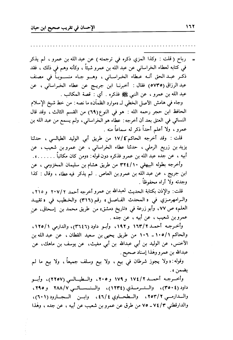 وجاء في هامش الأصل الخطي لـ"موارد الظمآن" ما نصه: من خط شيخ الإسلام الحافظ ابن حجر رحمه الله: هو في النوع "69" من القسم الثالث، وقد قال النسائي في العتق بعد أن أخرجه: عطاء هو الخرساني، ولم يسمع من عبد الله بن عمرو، ولا أعلم أحداً ذكر له سماعاً منه.