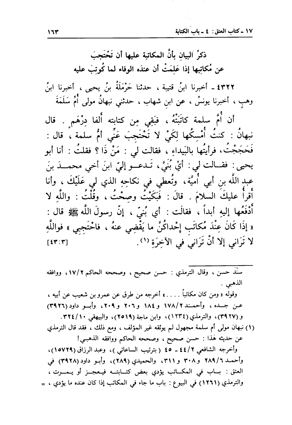 4322 - أخبرنا بن قتيبة، حدثنا حرملة بن يحيى، أخبرنا بن وَهْبٍ، أَخْبَرَنَا يُونُسُ، عَنِ ابْنِ شِهَابٍ، حَدَّثَنِي نَبْهَانُ مَوْلَى أُمِّ سَلَمَةَ أَنَّ أُمَّ سَلَمَةَ كَاتَبَتْهُ، فَبَقِيَ مِنْ كِتَابَتِهِ أَلْفَا دِرْهَمٍ. قَالَ نَبْهَانُ: كُنْتُ أَمْسِكُهَا لِكَيْ لَا تَحْتَجِبَ عَنِّي أُمُّ سَلَمَةَ، قَالَ: فَحَجَجْتُ، فَرَأَيْتُهَا بِالْبَيْدَاءِ، فَقَالَتْ لِي: مَنْ ذَا؟ فَقُلْتُ: أَنَا أَبُو يَحْيَى: فَقَالَتْ لِي: أَيْ بُنَيَّ، تَدْعُو إِلَيَّ ابْنَ أَخِي مُحَمَّدَ بْنَ عَبْدِ اللَّهِ بْنِ أَبِي أُمَيَّةَ، وَتُعْطِي فِي نِكَاحِهِ الَّذِي لِي عَلَيْكَ، وَأَنَا أَقْرَأُ عَلَيْكَ السَّلَامَ. قَالَ: فَبَكَيْتُ وَصِحْتُ، وَقُلْتُ: وَاللَّهِ لَا أَدْفَعُهَا إِلَيْهِ أَبَدًا، فَقَالَتْ: أَيْ بُنَيَّ، إِنَّ رَسُولَ اللَّهِ صَلَّى اللَّهُ عَلَيْهِ وَسَلَّمَ قَالَ: "إِذَا كَانَ عِنْدَ مُكَاتَبِ إِحْدَاكُنَّ مَا يَقْضِي عَنْهُ، فَاحْتَجِبِي" فَوَاللَّهِ لَا تراني إلا أن تراني في الآخرة 1.