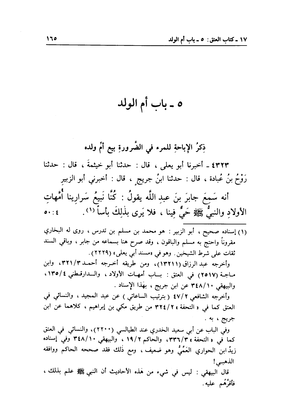 4323 - أَخْبَرَنَا أَبُو يَعْلَى، قَالَ: حَدَّثَنَا أَبُو خَيْثَمَةَ، قَالَ: حَدَّثَنَا رَوْحُ بْنُ عُبَادَةَ، قَالَ: حَدَّثَنَا ابْنِ جُرَيْجٍ، قَالَ: أَخْبَرَنِي أَبُو الزُّبَيْرِ أَنَّهُ سَمِعَ جَابِرَ بْنَ عَبْدِ اللَّهِ يَقُولُ: "كُنَّا نَبِيعُ سَرَارِينَا أُمَّهَاتِ الْأَوْلَادِ وَالنَّبِيُّ صَلَّى اللَّهُ عَلَيْهِ وَسَلَّمَ حَيٌّ فينا، فلا يرى بذلك بأسا" 1