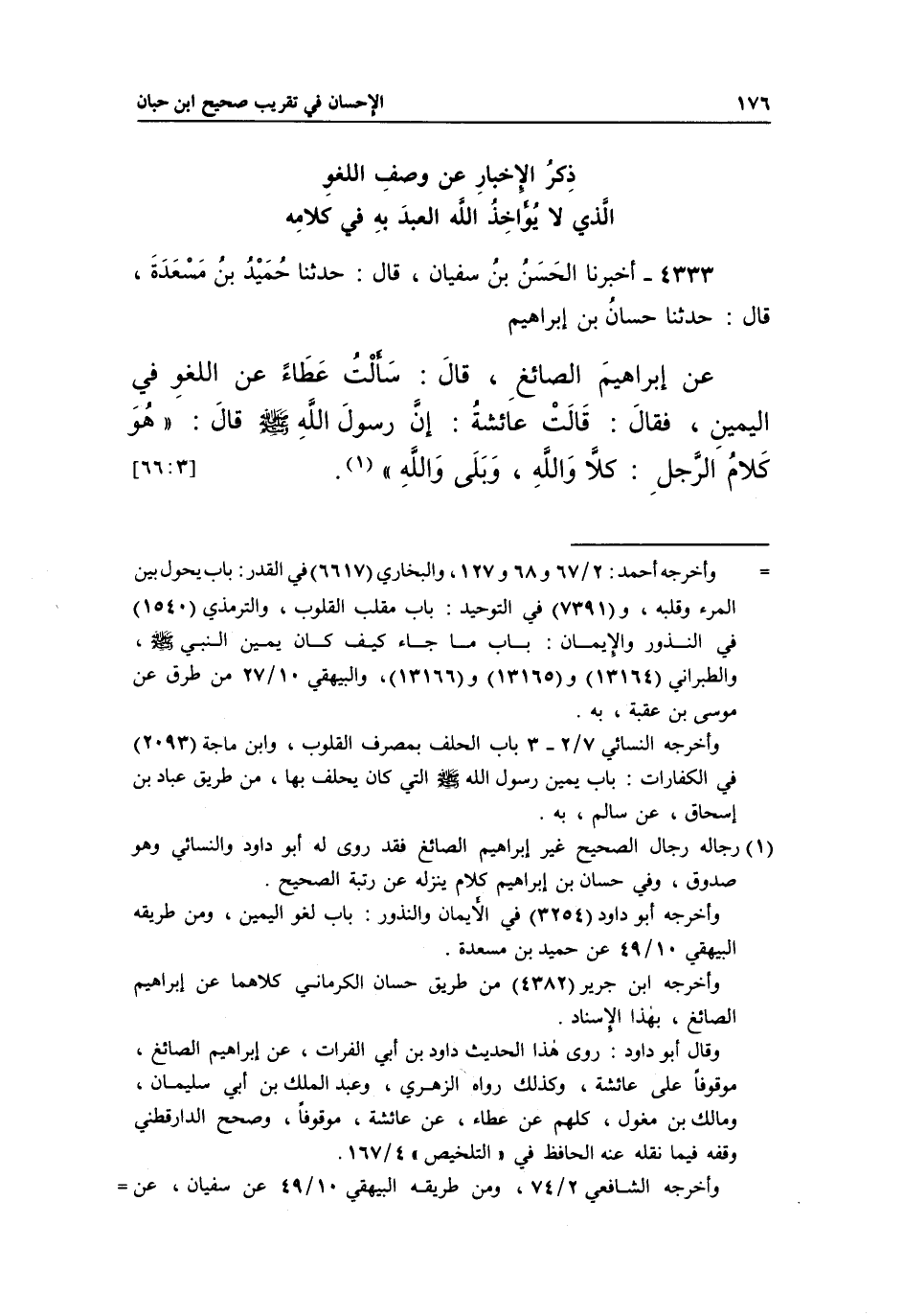 4333 - أَخْبَرَنَا الْحَسَنُ بْنُ سُفْيَانَ، قَالَ: حَدَّثَنَا حُمَيْدُ بْنُ مَسْعَدَةَ، قَالَ: حَدَّثَنَا حَسَّانُ بْنُ إِبْرَاهِيمَ عَنْ إِبْرَاهِيمَ الصَّائِغِ، قَالَ: سَأَلْتُ عَطَاءً عَنِ اللَّغْوِ فِي الْيَمِينِ، فَقَالَ: قَالَتْ عَائِشَةَ: أَنَّ رَسُولَ اللَّهِ صَلَّى اللَّهُ عَلَيْهِ وَسَلَّمَ قَالَ: "هُوَ كلام الرجل: كلا والله، وبلى والله" 1.