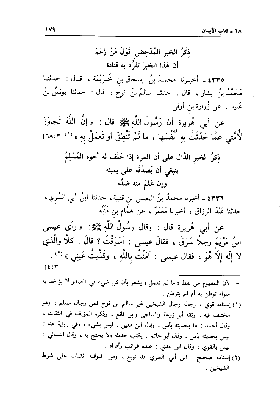 4335 - أَخْبَرَنَا مُحَمَّدُ بْنُ إِسْحَاقَ بْنِ خُزَيْمَةَ، قَالَ: حَدَّثَنَا مُحَمَّدُ بْنُ بَشَّارٍ، قَالَ: حَدَّثَنَا سَالِمُ بْنُ نُوحٍ، قَالَ: حَدَّثَنَا يُونُسُ بْنُ عُبَيْدٍ عَنْ زُرَارَةَ بْنِ أَوْفَى عَنْ أَبِي هُرَيْرَةَ أَنَّ رَسُولَ اللَّهِ صَلَّى اللَّهُ عَلَيْهِ وَسَلَّمَ قَالَ: "إِنَّ اللَّهَ تَجَاوَزَ لِأُمَّتِي عَمَّا حَدَّثَتْ بِهِ أَنْفُسَهَا ما لم تنطق أو تعمل به" 1.