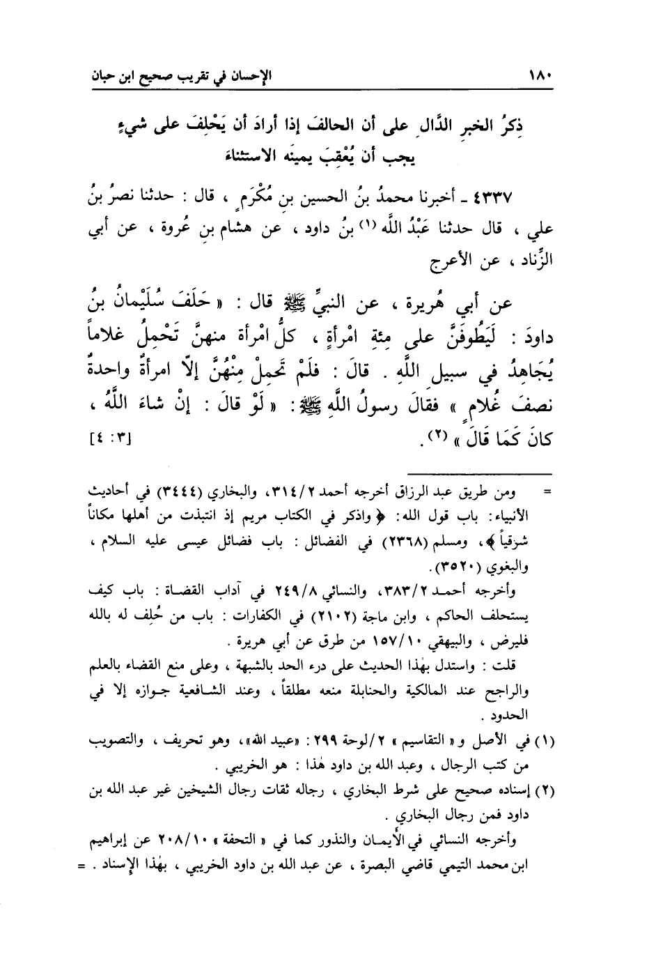 4337 - أَخْبَرَنَا مُحَمَّدُ بْنُ الْحُسَيْنِ بْنِ مُكْرَمٍ، قَالَ: حَدَّثَنَا نَصْرُ بْنُ عَلِيٍّ، قَالَ: حَدَّثَنَا عَبْدُ اللَّهِ1 بْنُ دَاوُدَ، عَنْ هِشَامُ بْنُ عُرْوَةَ، عَنْ أَبِي الزِّنَادِ، عَنِ الْأَعْرَجِ عَنْ أَبِي هُرَيْرَةَ، عَنِ النَّبِيِّ صَلَّى اللَّهُ عَلَيْهِ وَسَلَّمَ قَالَ: "حَلَفَ سُلَيْمَانُ بْنُ دَاوُدَ: لَيَطُوفَنَّ عَلَى مِائَةِ امْرَأَةٍ، كُلُّ امْرَأَةٍ مِنْهُنَّ تَحْمِلُ غُلَامًا يُجَاهِدُ فِي سَبِيلِ اللَّهِ. قَالَ: فَلَمْ تَحْمِلْ مِنْهُنَّ إِلَّا امْرَأَةٌ وَاحِدَةٌ نِصْفَ غُلَامٍ" فَقَالَ رَسُولُ اللَّهِ صَلَّى اللَّهُ عَلَيْهِ وَسَلَّمَ: "لَوْ قَالَ: إِنْ شَاءَ اللَّهُ، كان كما قال" 2.