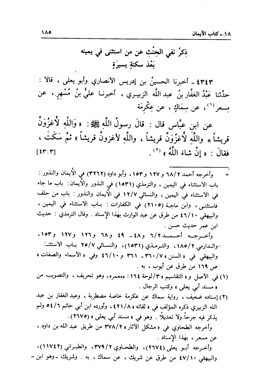 4343 - أَخْبَرَنَا الْحُسَيْنُ بْنُ إِدْرِيسَ الْأَنْصَارِيُّ وَأَبُو يَعْلَى، قَالَا: حَدَّثَنَا عَبْدُ الْغَفَّارِ بْنُ عَبْدِ اللَّهِ الزُّبَيْرِيُّ، أَخْبَرَنَا عَلِيُّ بْنُ مُسْهِرٍ، عَنْ مِسْعَرٍ1، عَنْ سِمَاكٍ، عَنْ عِكْرِمَةَ عَنِ ابْنِ عَبَّاسٍ قَالَ: قَالَ رَسُولُ اللَّهِ صَلَّى اللَّهُ عَلَيْهِ وَسَلَّمَ: "وَاللَّهِ لَأَغْزُوَنَّ قُرَيْشًا، وَاللَّهِ لَأَغْزُوَنَّ قُرَيْشًا، وَاللَّهِ لَأَغْزُوَنَّ قُرَيْشًا" ثم سكت، فقال: "إن شاء الله" 2.