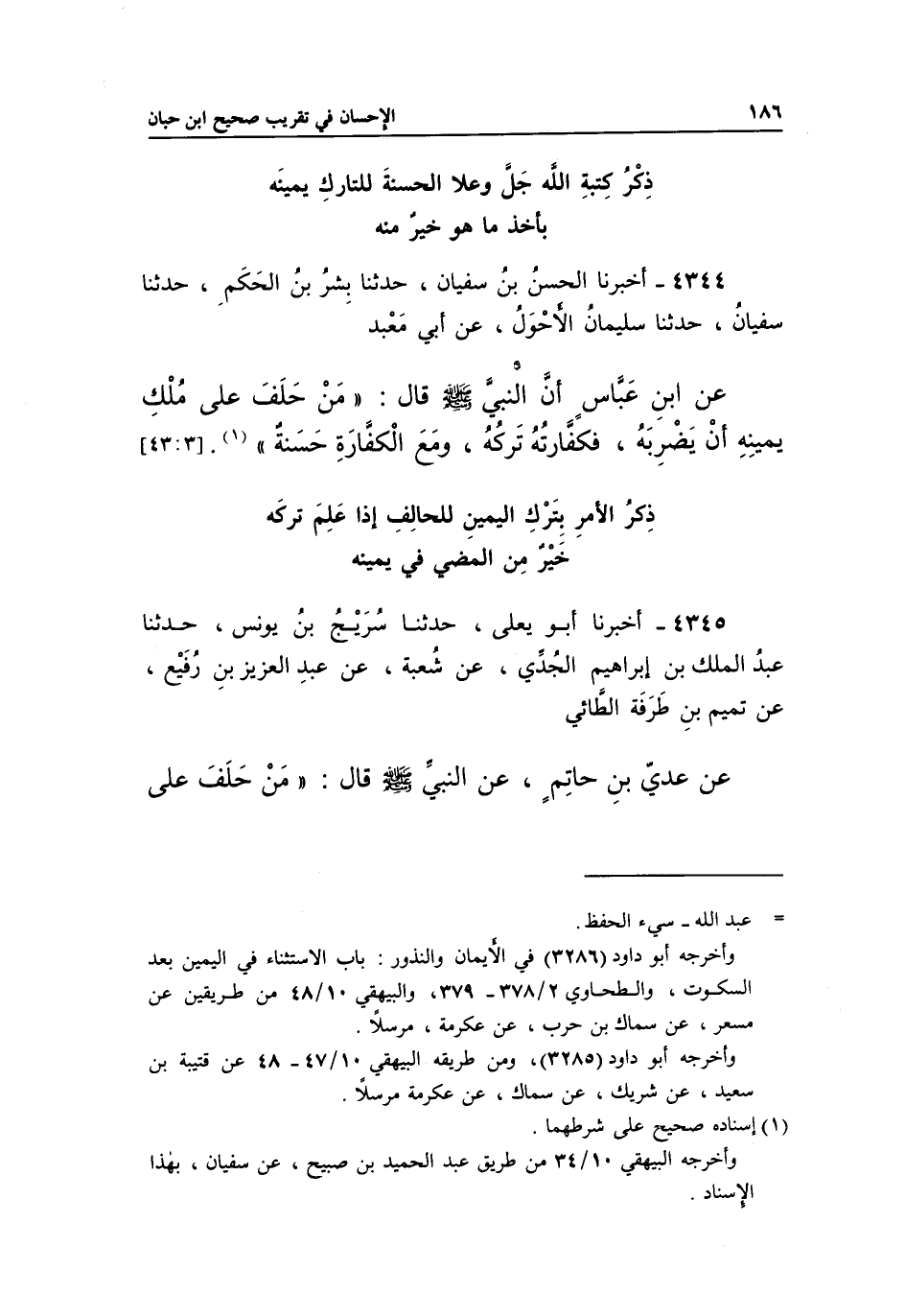 4344 - أَخْبَرَنَا الْحَسَنُ بْنُ سُفْيَانَ، حَدَّثَنَا بِشْرُ بْنُ الْحَكَمِ، حَدَّثَنَا سُفْيَانُ، حَدَّثَنَا سُلَيْمَانُ الْأَحْوَلُ، عَنْ أَبِي معبد عن بن عَبَّاسٍ أَنَّ النَّبِيَّ صَلَّى اللَّهُ عَلَيْهِ وَسَلَّمَ قَالَ: "مَنْ حَلَفَ عَلَى مُلْكِ يَمِينِهِ أَنْ يضربه، فكفارته تركه، ومع الكفارة حسنة" 1.