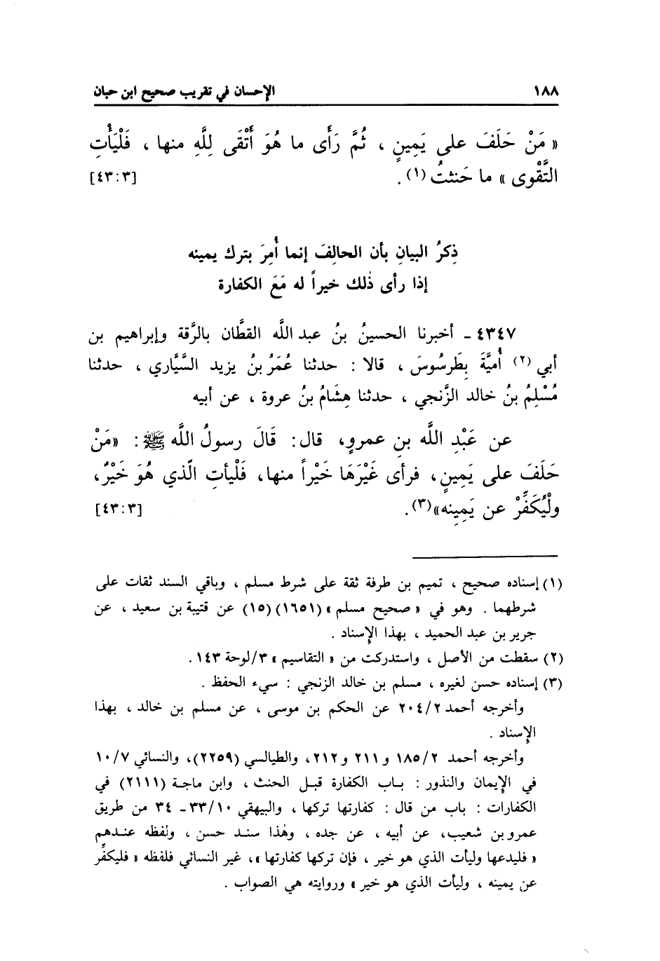 4347 - أَخْبَرَنَا الْحُسَيْنُ بْنُ عَبْدِ اللَّهِ الْقَطَّانُ بِالرَّقَّةِ وَإِبْرَاهِيمُ بْنُ أَبِي1 أُمَيَّةَ بِطَرَسُوسَ، قَالَا: حَدَّثَنَا عُمَرُ بْنُ يَزِيدَ السَّيَّارِيُّ، حَدَّثَنَا مُسْلِمُ بْنُ خَالِدٍ الزَّنْجِيُّ، حَدَّثَنَا هِشَامُ بْنُ عُرْوَةَ، عَنْ أَبِيهِ عَنْ عَبْدِ اللَّهِ بْنِ عَمْرٍو، قَالَ: قَالَ رَسُولُ اللَّهِ صَلَّى اللَّهُ عَلَيْهِ وسلم: "من حلف على يمين، فرأى غيرها خَيْرًا مِنْهَا، فَلْيَأْتِ الَّذِي هُوَ خَيْرٌ، وَلْيُكَفِّرْ عن يمينه" 2.