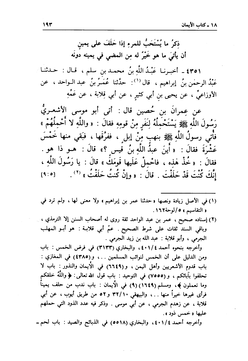 عَنْ عِمْرَانَ بْنِ حُصَيْنٍ قَالَ: أَتَى أَبُو مُوسَى الْأَشْعَرِيُّ رَسُولَ اللَّهِ صَلَّى اللَّهُ عَلَيْهِ وَسَلَّمَ يَسْتَحْمِلُهُ لِنَفَرٍ مِنْ قَوْمِهِ فَقَالَ: "والله لا أحملهم" فأتي رسول الله بِنَهْبٍ مِنْ إِبِلٍ، فَفَرَّقَهَا، فَبَقِيَ مِنْهَا خَمْسُ عَشْرَةَ فَقَالَ: "أَيْنَ عَبْدُ اللَّهِ بْنُ قَيْسٍ؟ " قَالَ: هُوَ ذَا هُوَ. فَقَالَ: "خُذْ هَذِهِ، فَاحْمِلْ عَلَيْهَا قَوْمَكَ" قَالَ: يَا رَسُولَ اللَّهِ، إِنَّكَ كُنْتَ قَدْ حَلَفْتَ، قَالَ: "وَإِنْ كُنْتُ حلفت" 2.