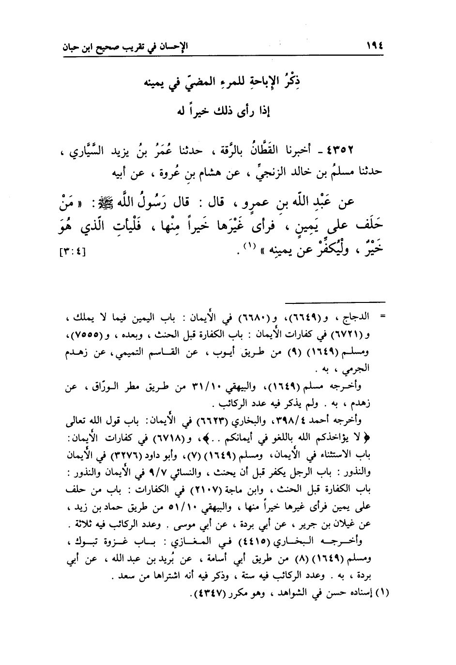 4352 - أَخْبَرَنَا الْقَطَّانُ بِالرَّقَّةِ، حَدَّثَنَا عُمَرُ بْنُ يَزِيدَ السَّيَّارِيُّ، حَدَّثَنَا مُسْلِمُ بْنُ خَالِدٍ الزَّنْجِيُّ، عَنْ هِشَامِ بْنِ عُرْوَةَ، عَنْ أَبِيهِ عَنْ عَبْدِ اللَّهِ بْنِ عَمْرٍو، قَالَ: قَالَ رَسُولُ اللَّهِ صَلَّى اللَّهُ عَلَيْهِ وَسَلَّمَ: "مَنْ حَلَفَ على يمين، فرأى غيرها خَيْرًا مِنْهَا، فَلْيَأْتِ الَّذِي هُوَ خَيْرٌ، وَلْيُكَفِّرْ عن يمينه" 1.