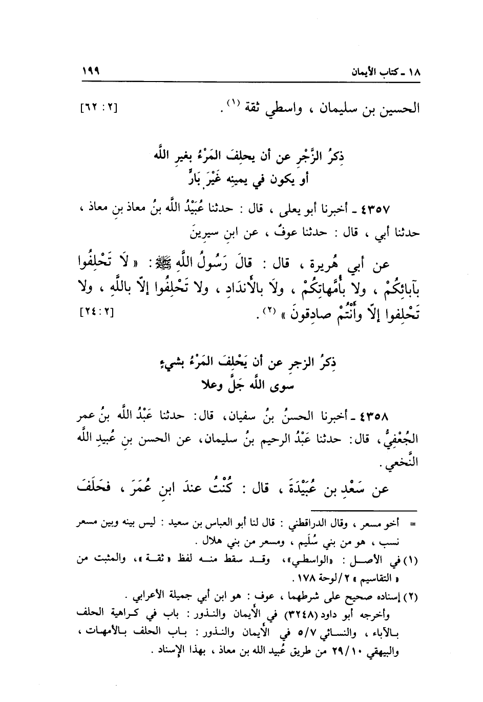 4358 - أَخْبَرَنَا الْحَسَنُ بْنُ سُفْيَانَ، قَالَ: حَدَّثَنَا عَبْدُ اللَّهِ بْنُ عُمَرَ الْجُعْفِيُّ، قَالَ: حَدَّثَنَا عَبْدُ الرَّحِيمِ بْنُ سُلَيْمَانَ، عَنِ الْحَسَنِ بْنِ عُبَيْدِ اللَّهِ النَّخَعِيِّ عَنِ سَعْدِ بْنِ عُبَيْدَةَ، قَالَ: كُنْتُ عِنْدَ ابْنِ عمر، فحلف