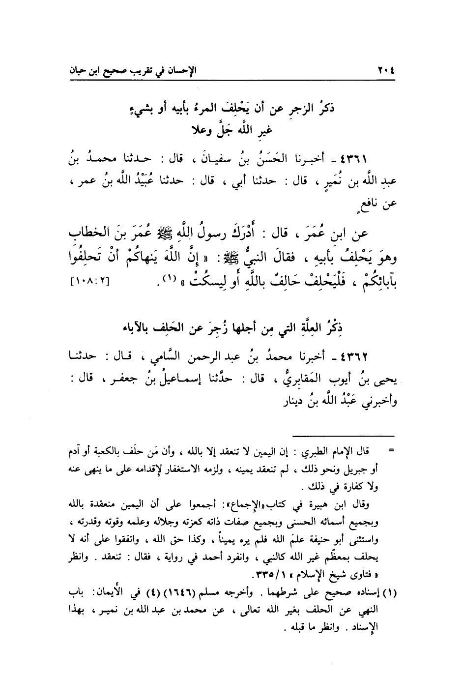 4361 - أَخْبَرَنَا الْحَسَنُ بْنُ سُفْيَانَ، قَالَ: حَدَّثَنَا مُحَمَّدُ بْنُ عَبْدِ اللَّهِ بْنِ نُمَيْرٍ، قَالَ: حَدَّثَنَا أَبِي، قَالَ: حَدَّثَنَا عُبَيْدُ اللَّهِ بْنُ عُمَرَ، عَنْ نَافِعٍ عَنِ ابْنِ عُمَرَ، قَالَ: أَدْرَكَ رَسُولُ اللَّهِ صَلَّى اللَّهُ عَلَيْهِ وَسَلَّمَ عُمَرَ بْنَ الْخَطَّابِ وَهُوَ يَحْلِفُ بِأَبِيهِ، فَقَالَ النَّبِيُّ صَلَّى اللَّهُ عَلَيْهِ وَسَلَّمَ: "إِنَّ اللَّهَ يَنْهَاكُمْ أَنْ تَحْلِفُوا بِآبَائِكُمْ، فَلْيَحْلِفْ حَالَفٌ بِاللَّهِ أَوْ لِيَسْكُتْ" 1.